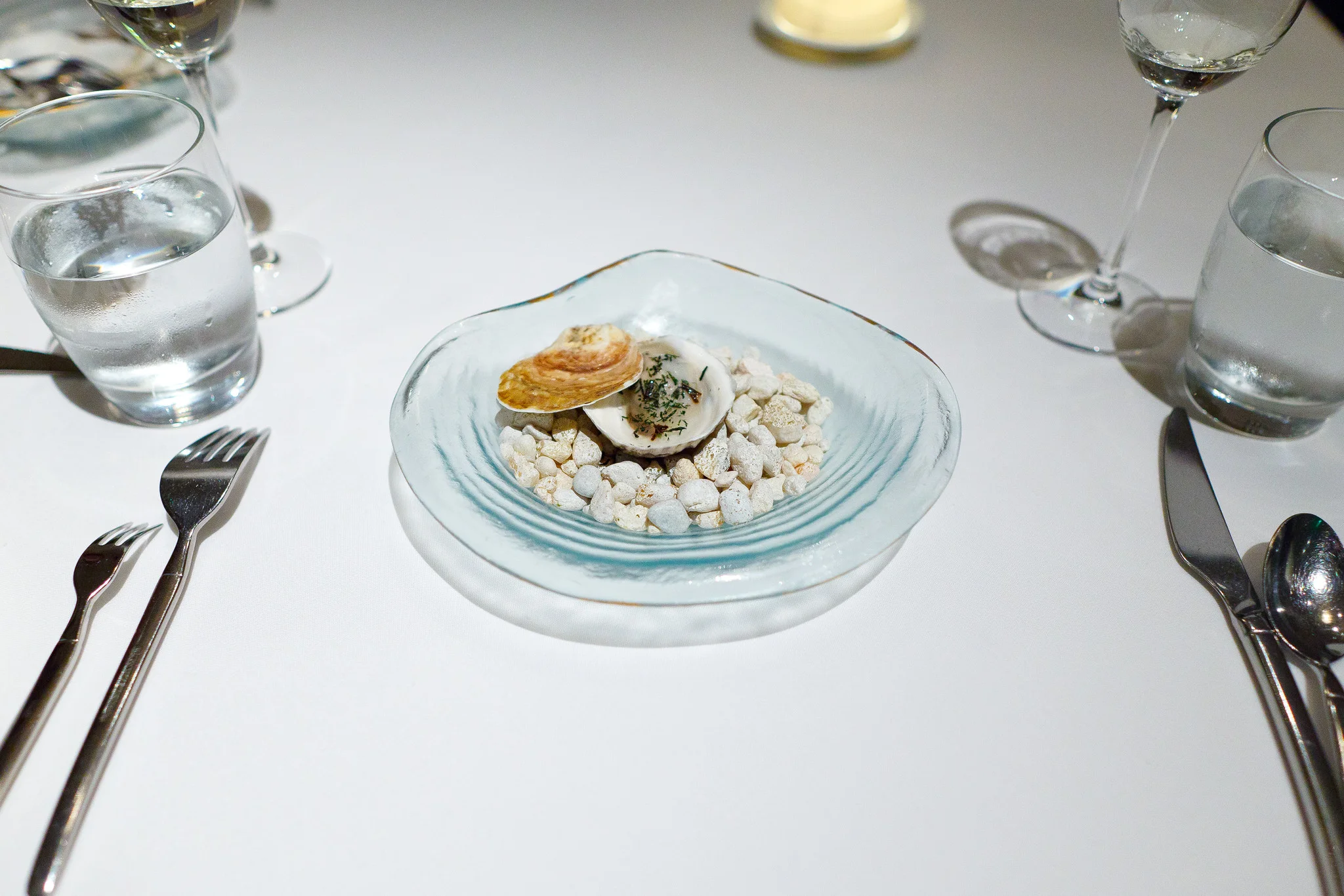 3rd Course - "An elemental oyster" - Lightly poached in its own shell, ocean water gelée, nori flakes