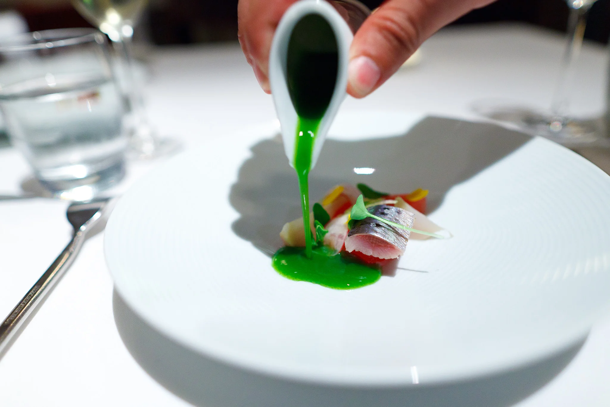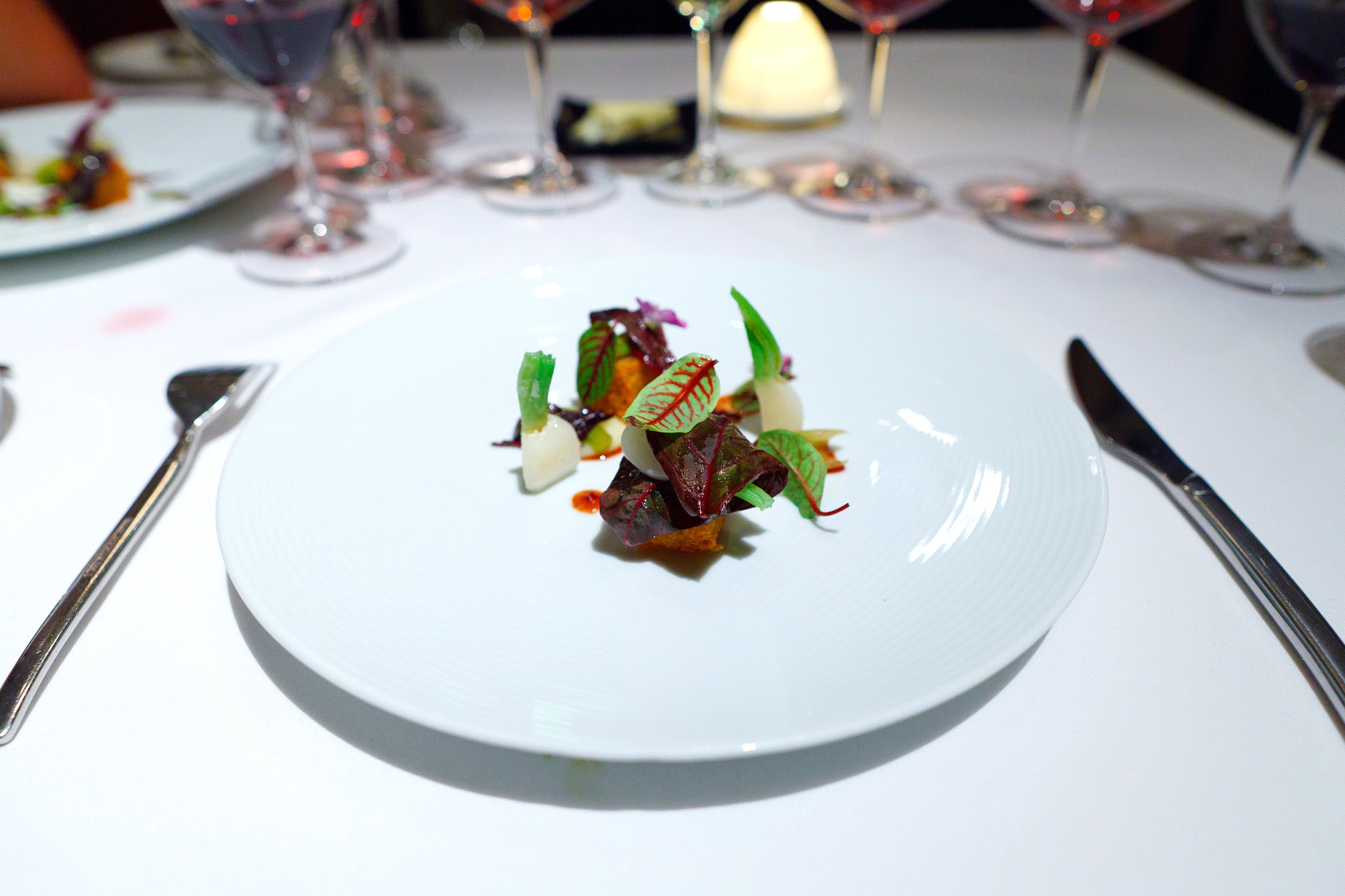 Japanese sardines with beets, watermelon, radish, and a garden sorrel sauce - A small sardine carried by the fresh vegetal bitterness of the chilled sorrel sauce. The sweet chunks of compressed watermelon and beets added a hint of sugar to an otherwise savory dish. This was a minimalist dish exemplifying how the freshness of raw vegetables can enhance the freshness of the sea. A simple dish with little cooking, where chef Kinch took a step back and let the natural ingredients speak for themselves.