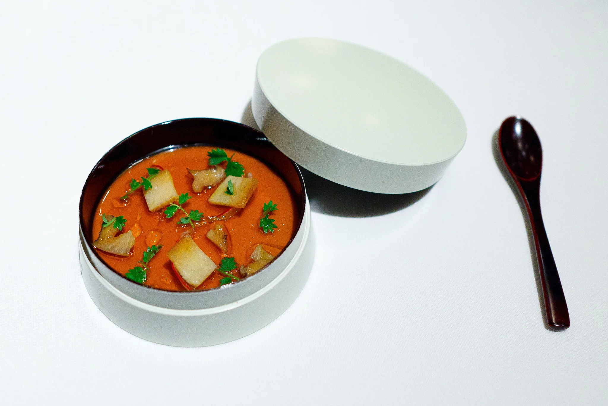 4th Course - Pig leaf curd, coriander granita, marcona almond, strawberry gazpacho