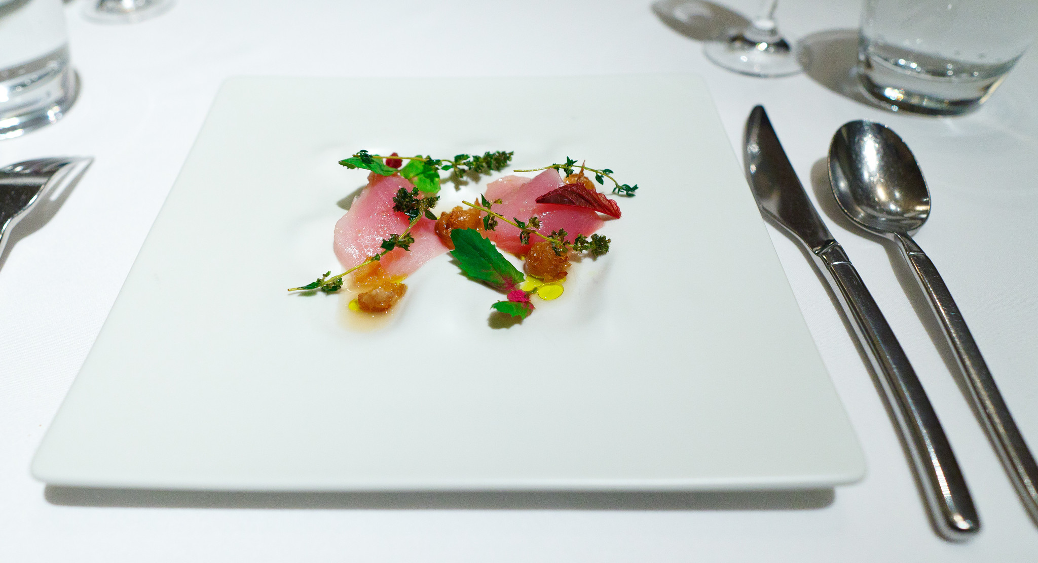 Albacore tuna, runner beans, crispy bean shell bouillon, lemon verbena, olive oil - This was chef Kinch's sashimi course in a traditional kaiseki sequence. The tuna was lean but still buttery with an herbal note that grounded the dish to California.