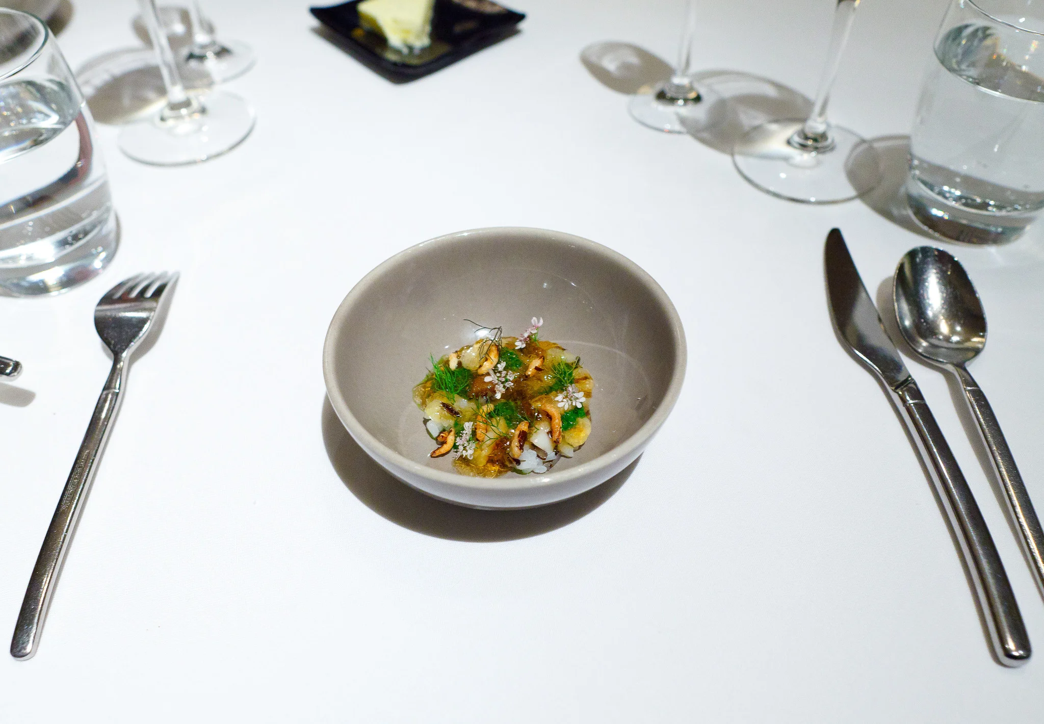 Razor clams - A small bowl of razor clams with wild rice, chrysanthemum and roast chicken gelée, topped with fennel fronds. This was another incredible dish. Chewy, plump grains of wild rice topped with chunks of razor clam whose meaty flavor was enhanced by the roast chicken gelée. The chrysanthemum and fennel fronds added an anise-like herbal dimension that kept each bite interesting. This was a dish that took me back to the rice courses from some of my favorite kaiseki experiences in Japan.