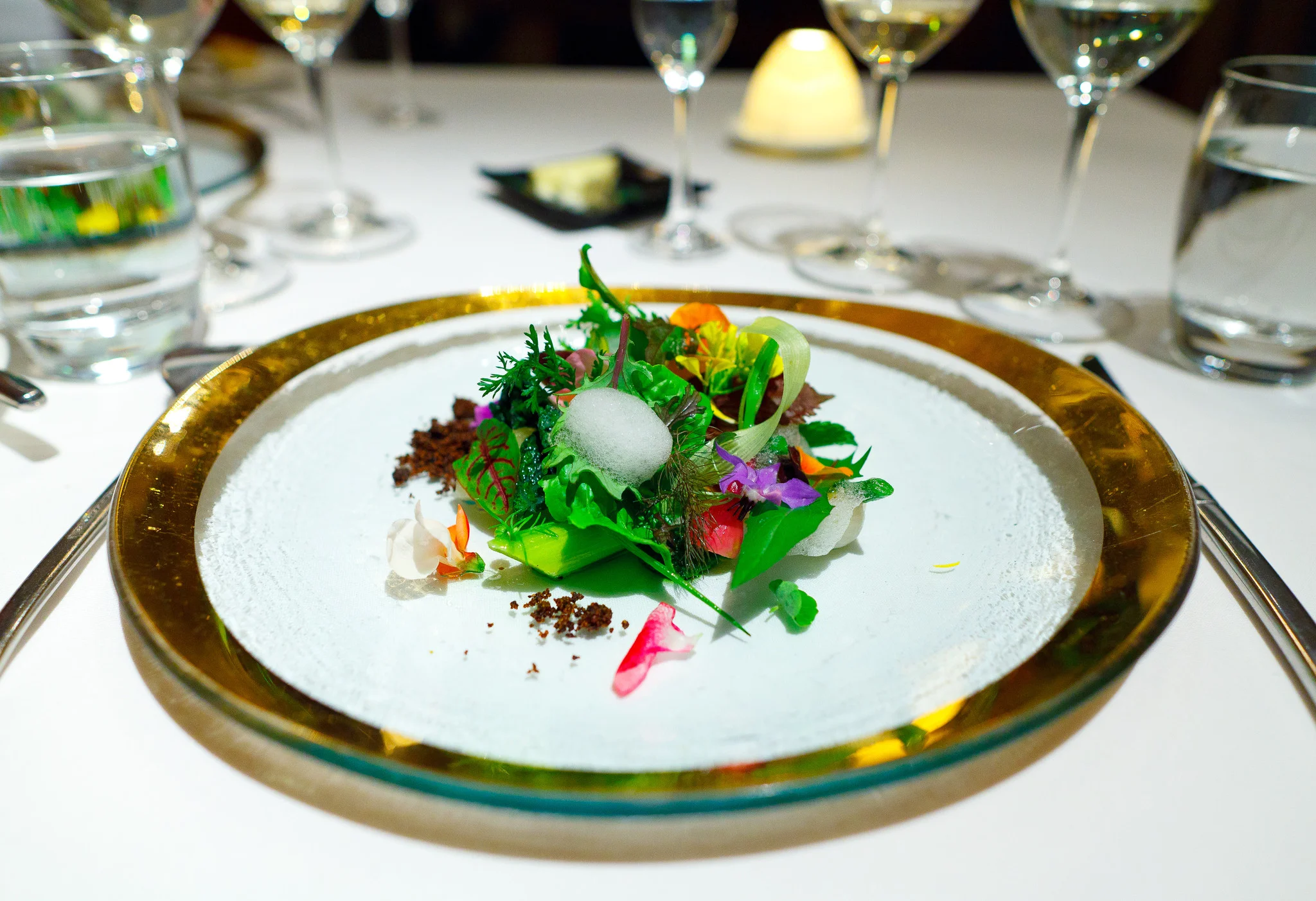 Into the vegetable garden - A handpicked showcase of the day's herbs from Love Apple Farms combined into a beautiful, colorful potpourri. I loved this dish and Kinch's local interpretation of the gargouillou. This dish was a collection of textures both smooth and crunchy and herbal flavors ranging from sweet to bitter. My only complaint is that it's a bit awkward to eat these delicate, almost weightless leaves with a full-sized fork and knife; it would have been easier with a pair of fine chopsticks or culinary forceps. This is a dish that connects Manresa to its surroundings, a reminder that California has the finest produce in the country.
