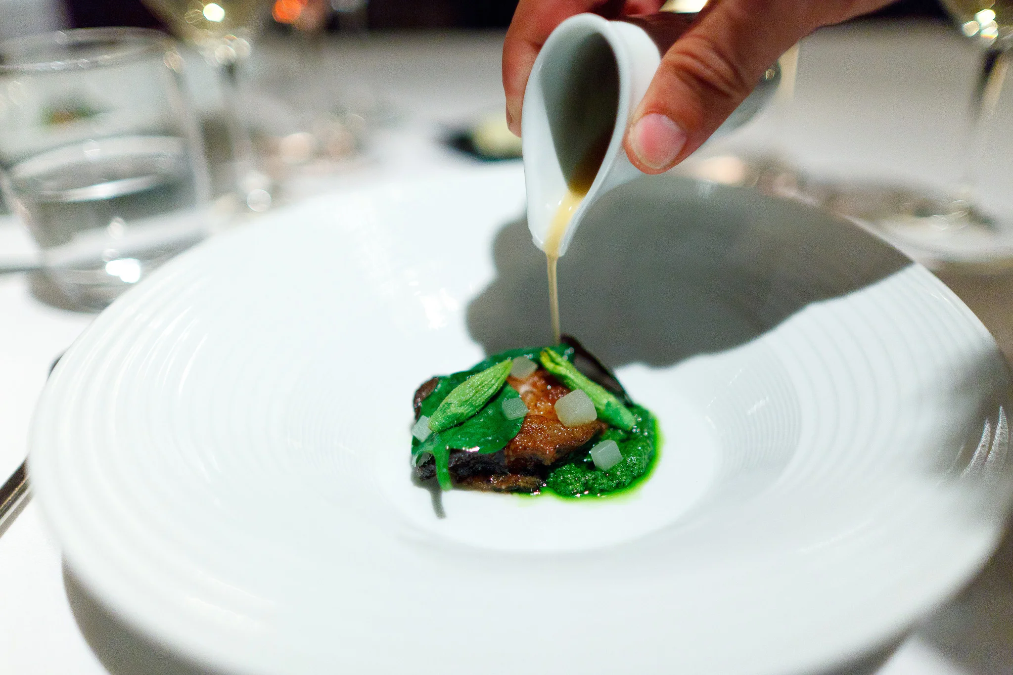 Suckling porcelet - A generous cut of young pig served with chanterelle mushrooms, apricot-anise purée, courgette velouté, and a pistachio pesto. This was a heavier course and although fatty, the crispy skin really helped diversify the texture; the crunch was the best part of this dish.
