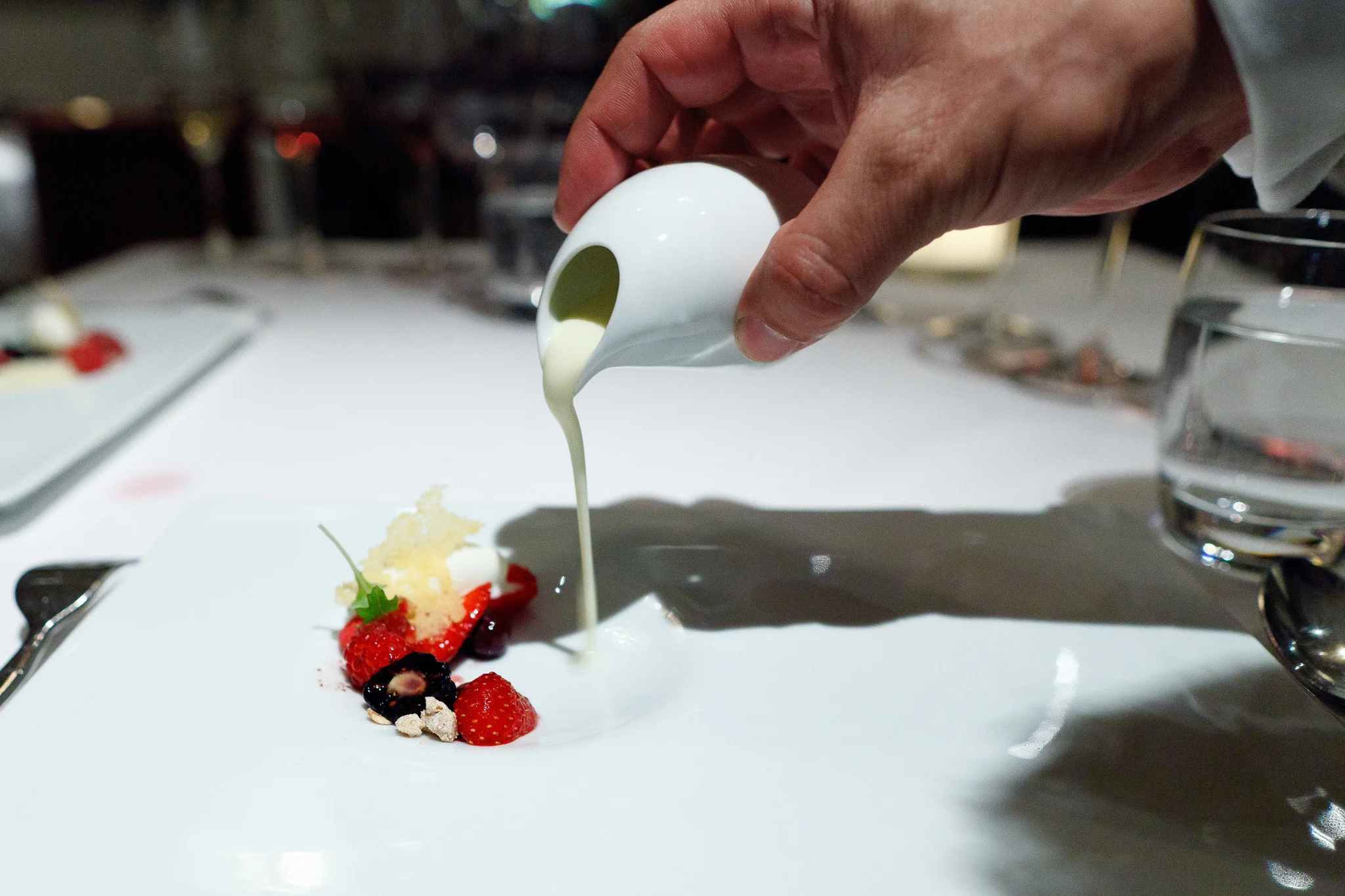 Summer berries and cream - Summer berries, both roasted and raw with a lemon cream. Underneath the berries was a bed of açaí granite and yogurt sorbet. This was light and sweet with the cream sauce giving the dish some substance, but the lemon ensuring it tasted bright and refreshing.