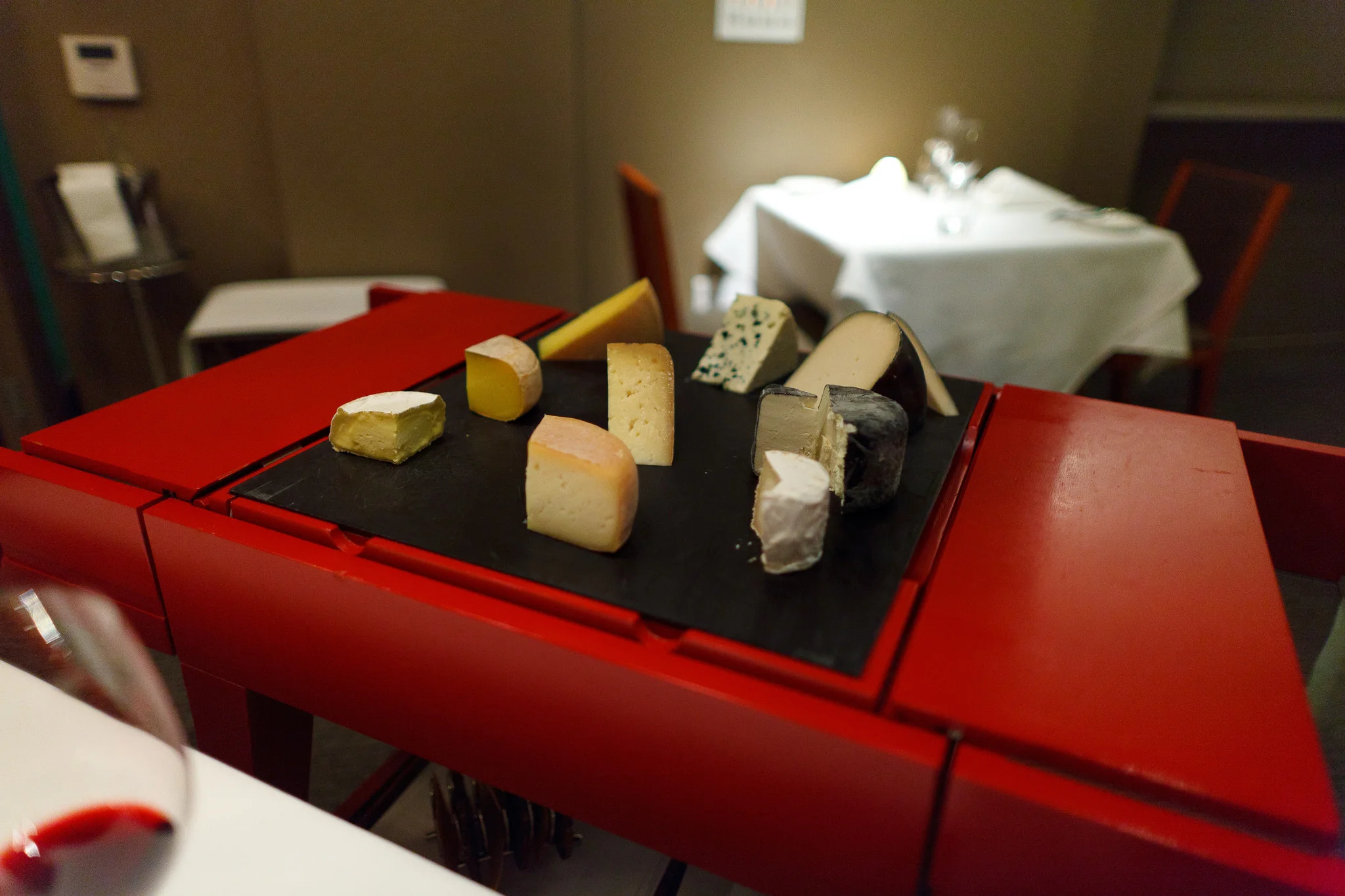 The cheese cart - Bent river, Blond d'Espèce, Pleasant Ridge reserve, Amarello de beta spacious, Garden Variety's Moonflower, Gabriel Coulet Roquefort, Redwood Hill's Bucheret, Chèvriere Cendre, and Cypress Grove Midnight Moon.