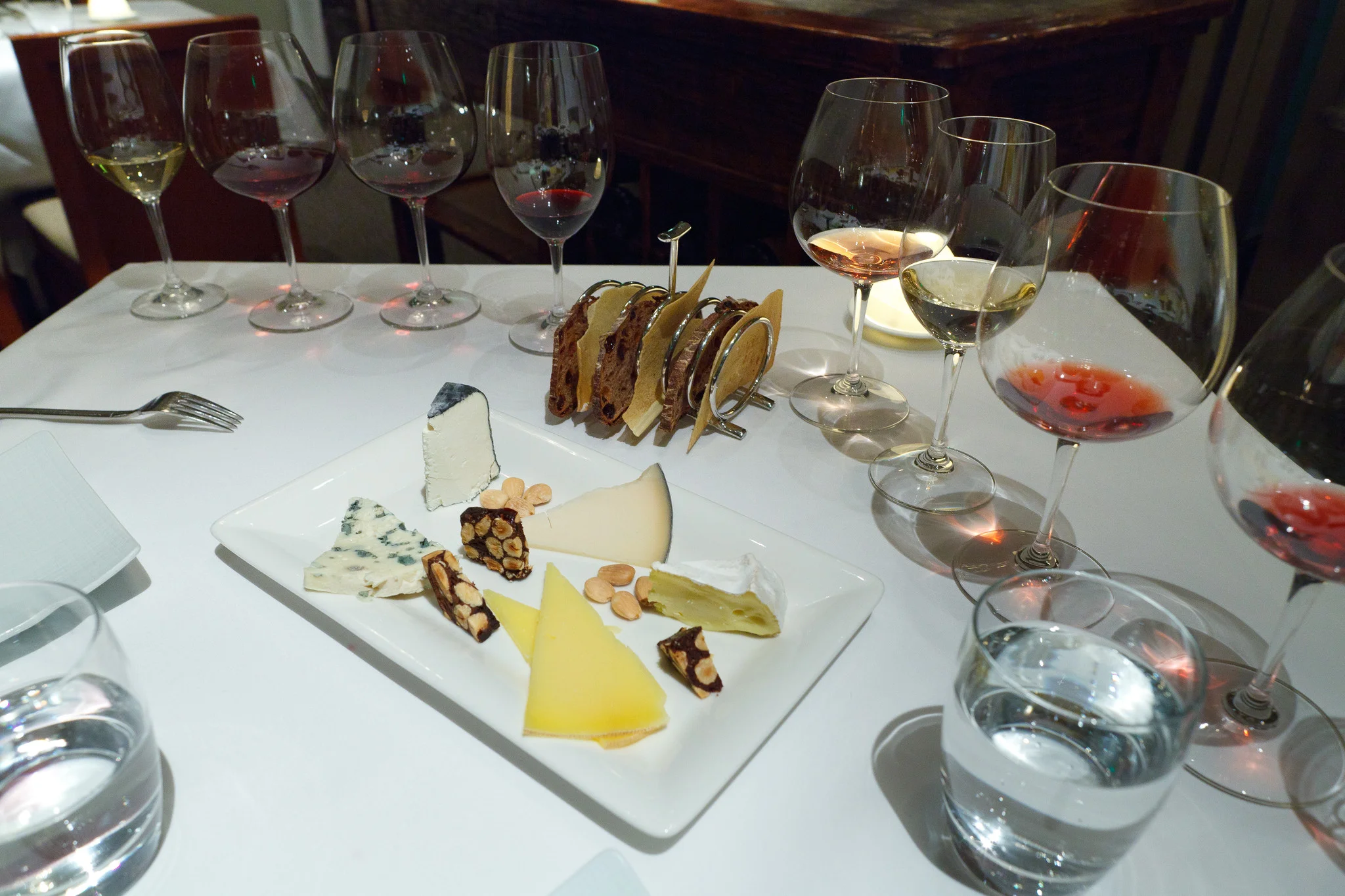 We chose a few pieces from the cart: Roquefort, Chevrière cendre (concord grape ash), Gouda-style Midnight moon, Cow's milk Pleasant ridge reserve, and Bent River.