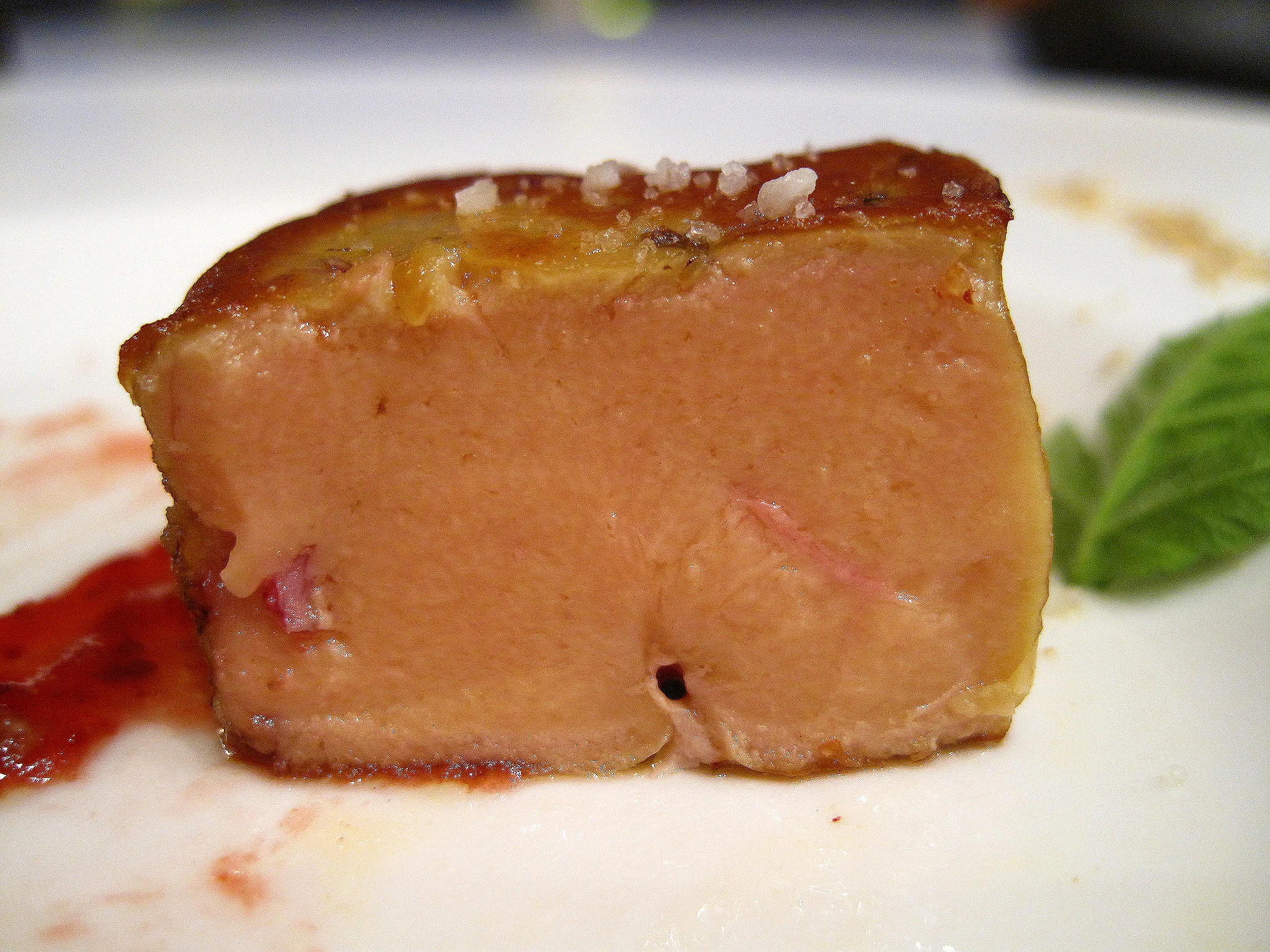 Michel Bras - La tranche de foie gras de canard grillée, confit acide de fraises et cèbe de Lézignan rôtie, valériane phu et niac, citron, cumin, anis vert, up close