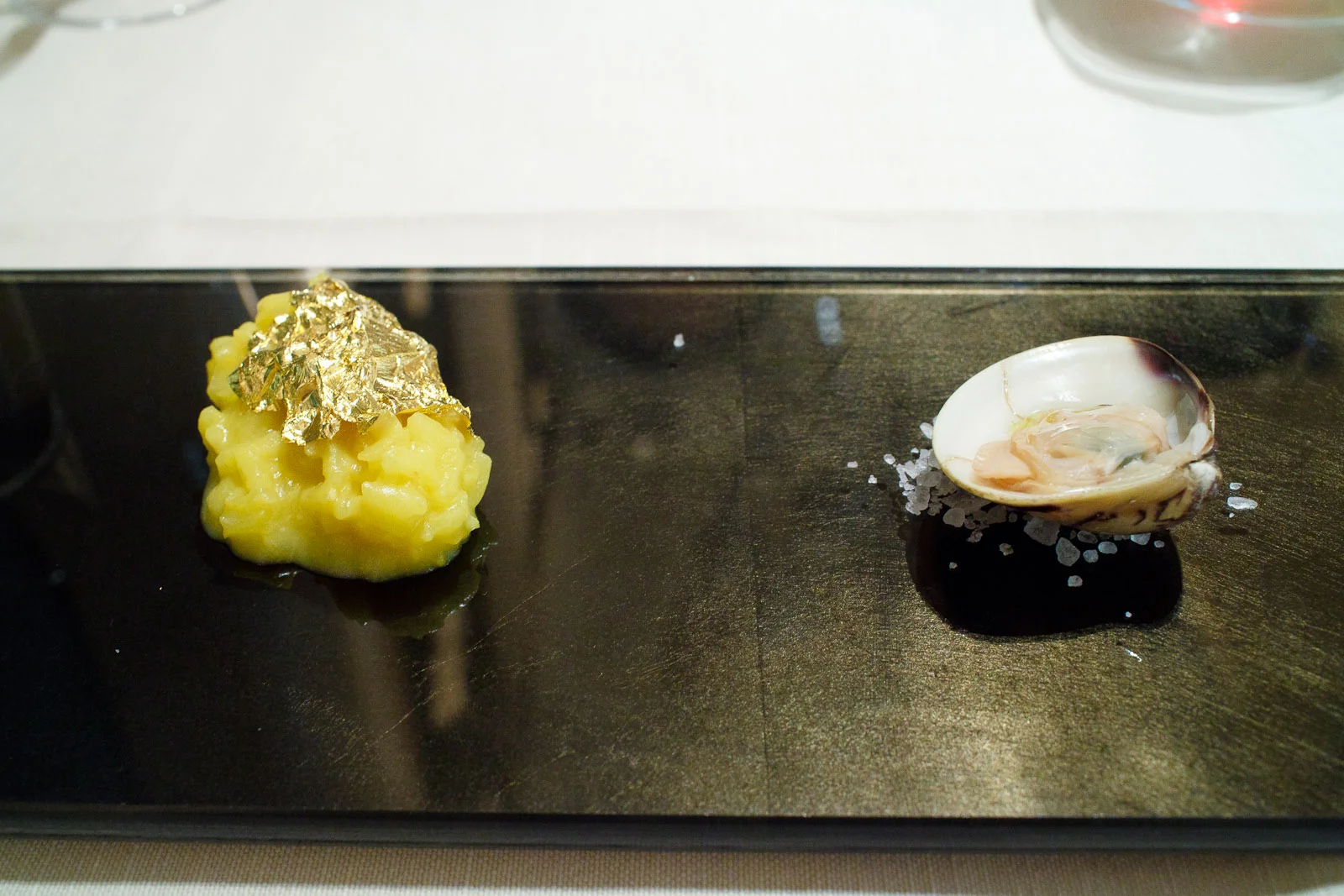 This past New Year's Eve we found ourselves in Osaka, one of the "kitchens of Japan." Unfortunately for us, the time around New Year's is a dead zone in Japan: nearly every restaurant is closed for the week-long New Year's holiday. There were some restaurants open, but they were all located inside the major hotels. There was a part of me that wanted to stick to Japanese-only "local" food, but another that was pretty hungry. Having never tried Italian cuisine in Japan, I made a last-minute reservation at the newly opened Italian restaurant at the St. Regis: La Veduta. The dining room was gorgeous: oversized chandeliers illuminating an open kitchen with large windows providing a view over downtown Osaka. Our maitre'd was Piemontese, a pleasant surprise of authenticity being nearly 6,000 miles away from Italy. The menu was prix-fixe which took the stress out of ordering. We ordered a glass of champagne and mentally transported ourselves to Europe.