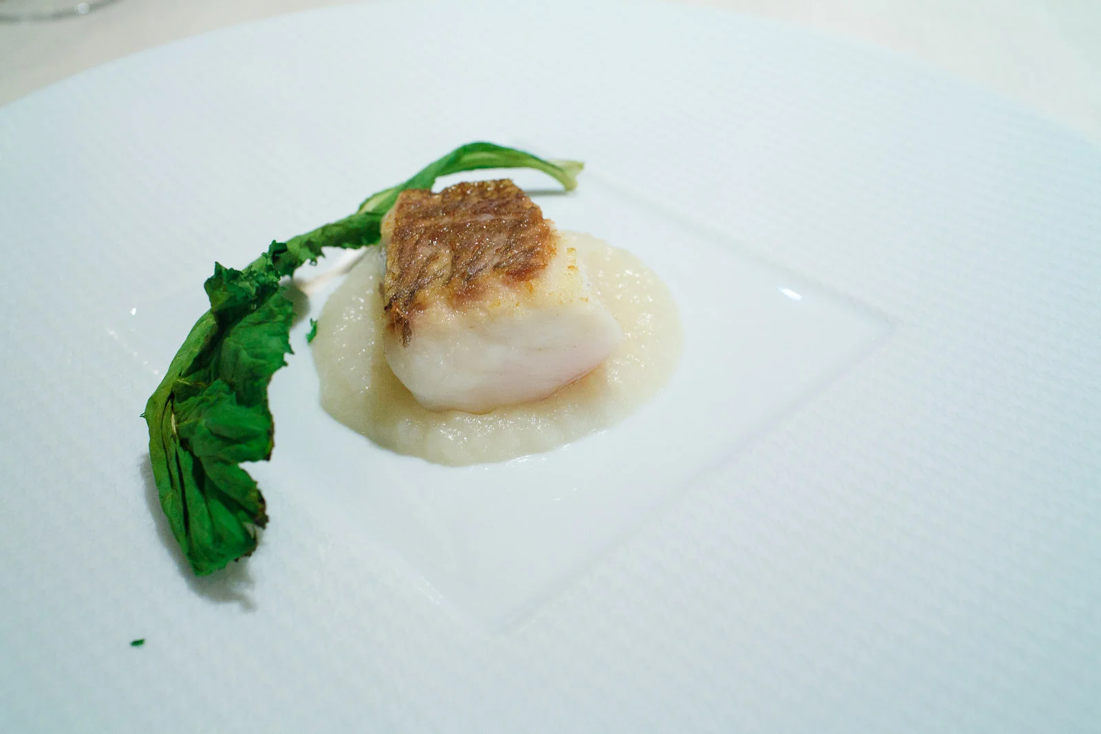 Dentice di territorio e rapa di tennouji - Filet of sea bream atop a turnip puree. The puree was not at all starchy making this very light. The fish was a tiny bit overcooked -- not dry, but not moist either.