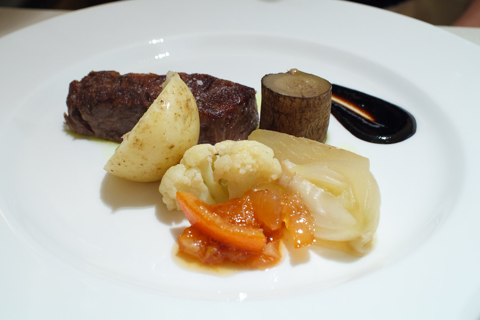 Bollito misto al mostarda - A rendition of the classic Northern Italian "boiled dinner." According to legend, Prince Vittorio Emanuele would secretly venture from court in Torino to far away Moncalvo for the country's best boiled dinner. In this meal, all the ingredients are boiled separately and combined on the plate. This "rendition," however, featured a braised filet and a candied orange. The candied orange was very acidic -- even overpowering -- even when eaten with the fatty filet. The vegetables were ok; but boiled vegetables, traditional or not, are never really that appealing for me. Though they are a big part of the Japanese diet, particularly as part of kaiseki's simmered dishes.