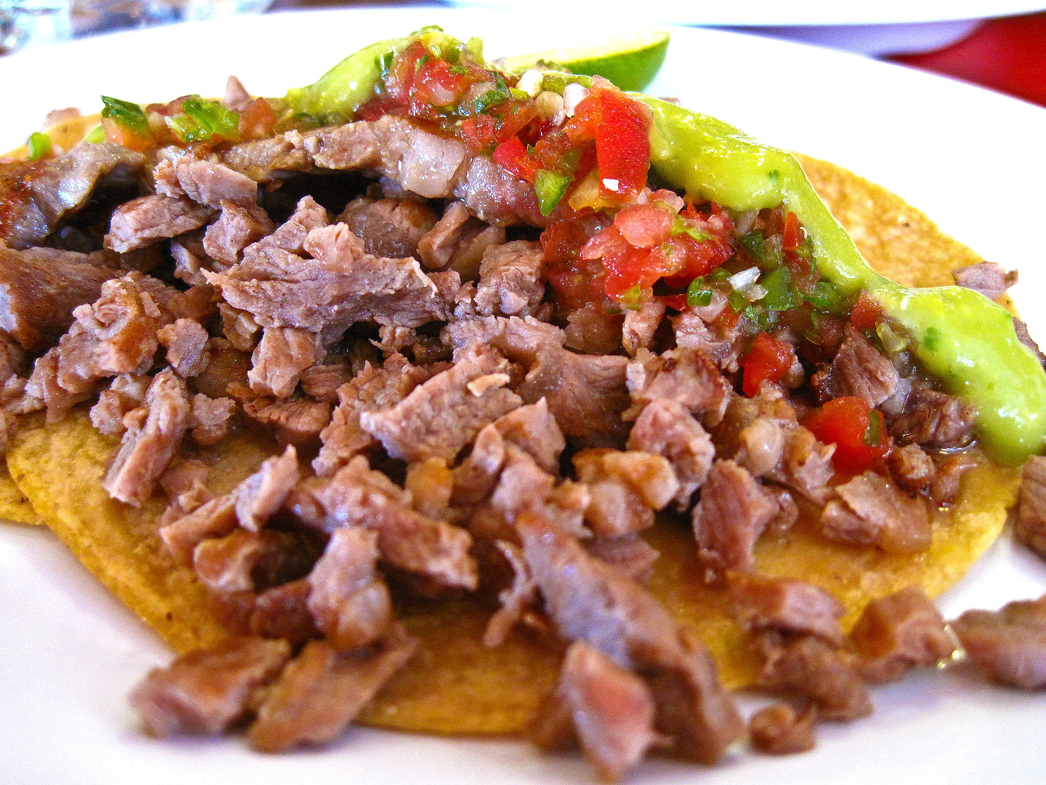 Taco de res - Chunks of fatty beef a top a corn tortilla. The taco is served quite plainly and garnished table-side with a variety of salsas. The guacamole is pure, creamy, and thin; chunky guacamole seems to be a state-side invention. I put on a dab of pico de gallo, but I seemed to be the only person at the table doing that.