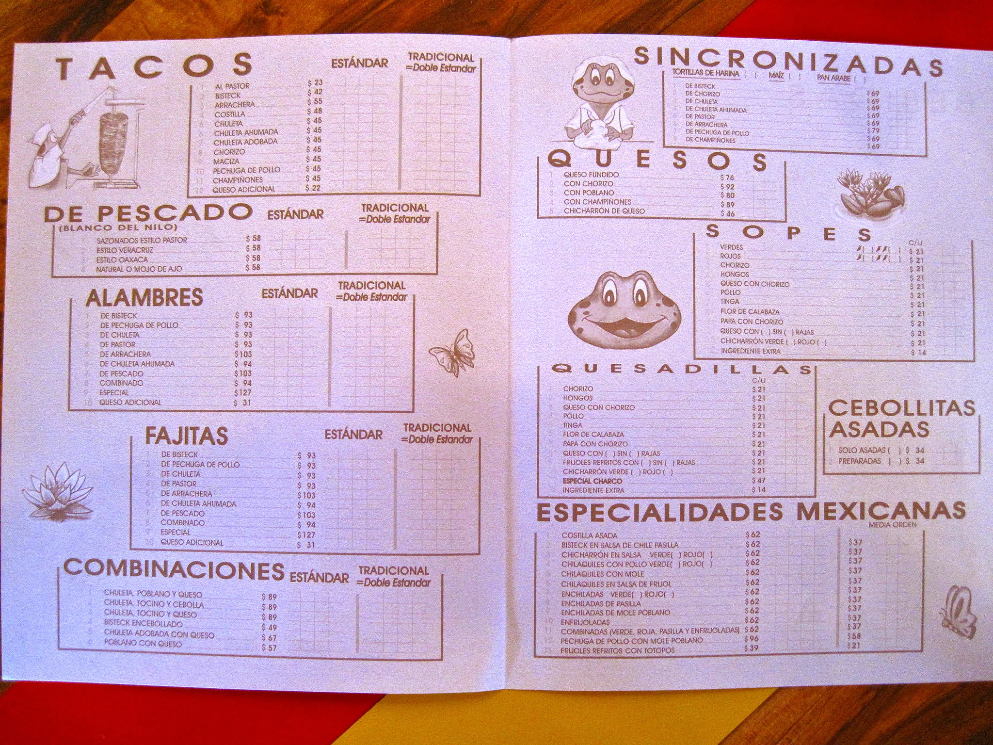 Finding the best tacos al pastor in Mexico City is akin to finding the best baguette in Paris. There are so many places of exceptional quality; the differences come down to stylistic nuances in flavor and preparation. The best taco al pastor in Mexico City is the closest taquería nearby above a minimum quality threshold that's open late-night. Fortunately, the city is full of such restaurants. One of them is El Charco de las Ranas, or "frog's puddle." It's a sit-down restaurant as opposed to a street-side taco stand. The authenticity police might get angry that real tacos are to be consumed sitting down, but rest assured this is the real deal. There's a full kitchen in the back with a fire-roasted rotating pork spit by the door. The smell of roasting pork permeates the entire restaurant.