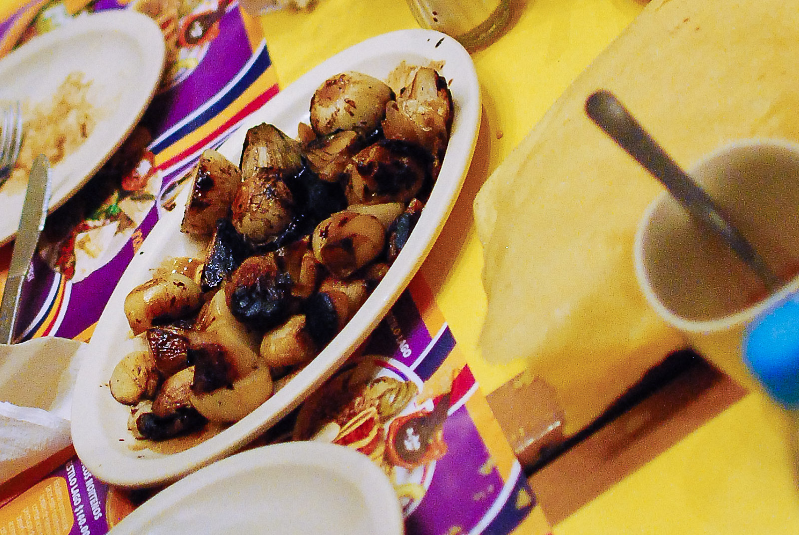 Cebolla al grill - Charred onions dripped in salsa maggi, salt, and pepper. The cooking (burning) process lends them a smoky and sweet flavor. Despite the apparent blackening on the bottom they did not taste burnt, though they probably weren't too good for your health either. These were fun to eat until the main food came -- sweet without any burn.