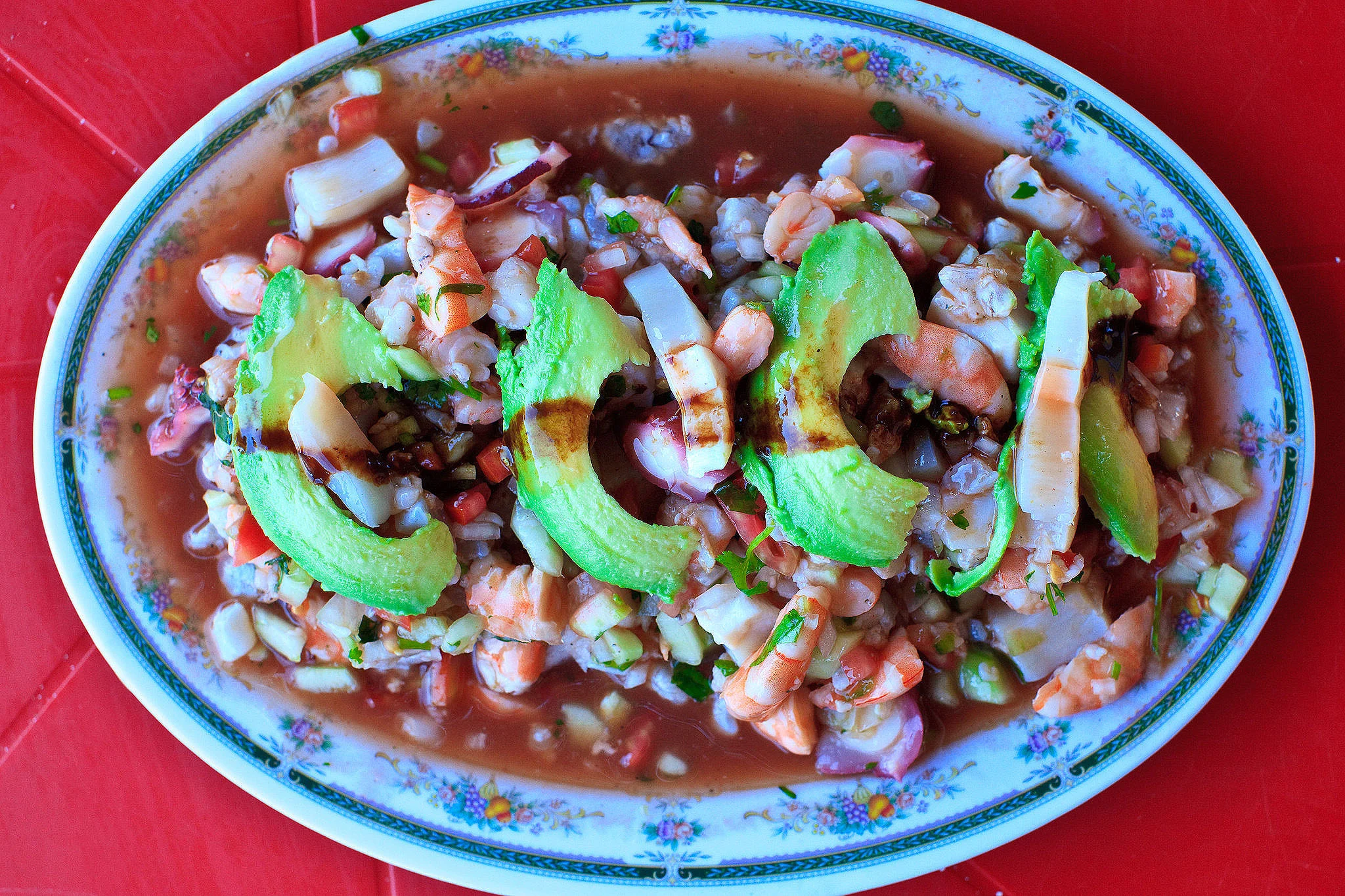 Plato de camarones con pulpo - Coarsely cut chilled shrimp and octopus in a plate of shrimp broth garnished with fresh avocado and tons of lime. The combination of avocado, lime, and raw shrimp is one of my favorite Mexican flavors. The sweetness of the shrimp and octopus with the bite of the lime and the buttery-smooth flavor of the avocado make this exceptional.