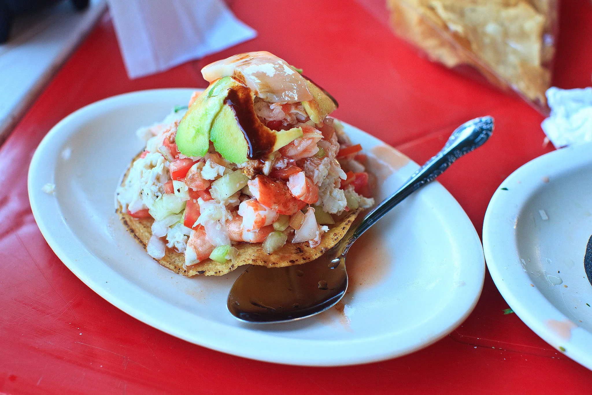Tostadita de jaiba y camarones - Local crab and shrimp mixed with tomato, red onion, and cucumber atop a crispy corn tortilla. The pile of shellfish is adorned with thin strips of avocado and a drop of salsa maggi. Mexicans seem to be able to eat this without a fork and knife; my attempt at mimicry resulted in a total mess. I guess that's why they gave me a spoon.