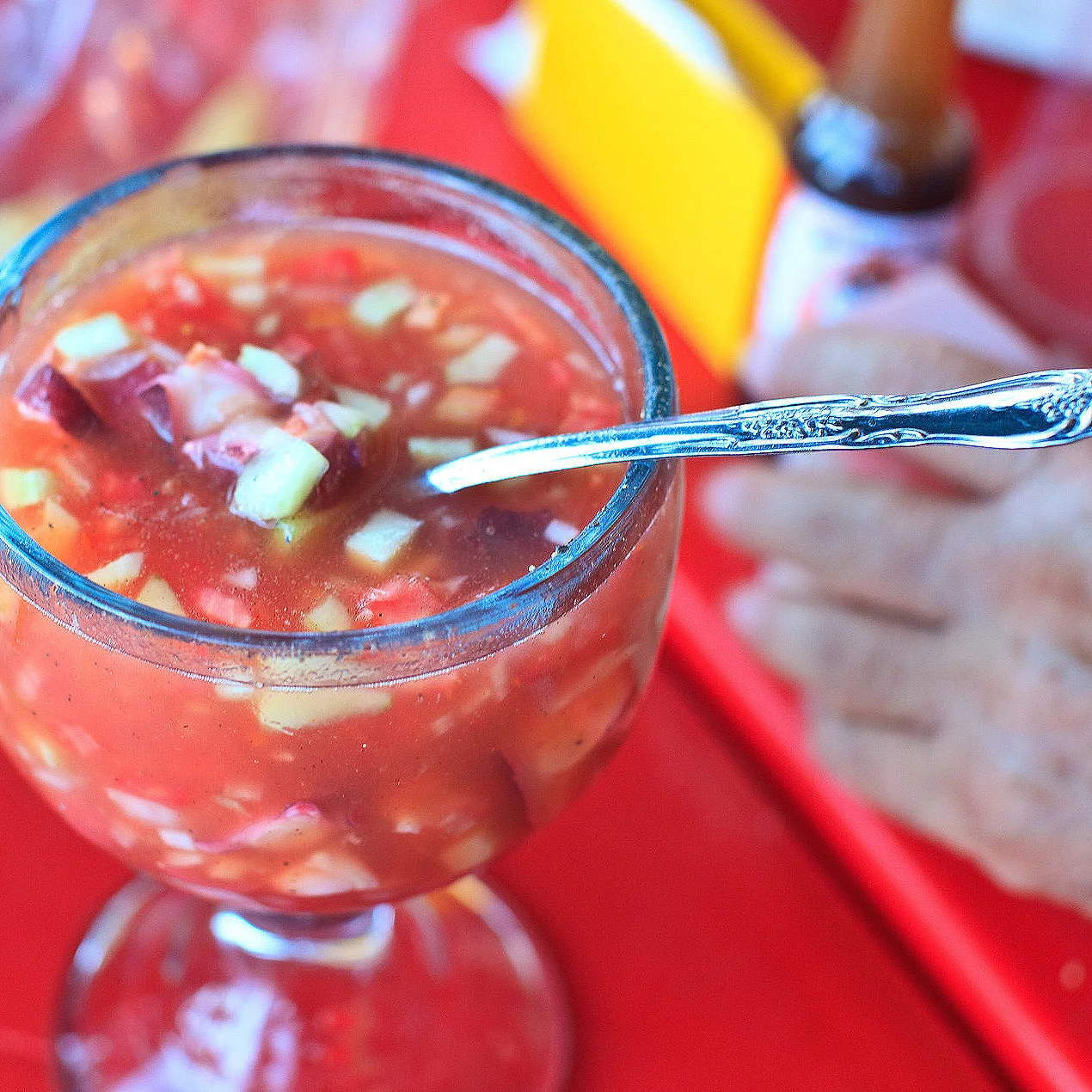 Cocktail de pulpo - A goblet of chilled shrimp broth with tomato, red onion, cucumber, lime, and giant pieces of octopus. In a lot of ways this is like a thin broth gazpacho filled with shellfish. The broth tastes exceptional by itself -- even when the chunks of shellfish and vegetable are gone.