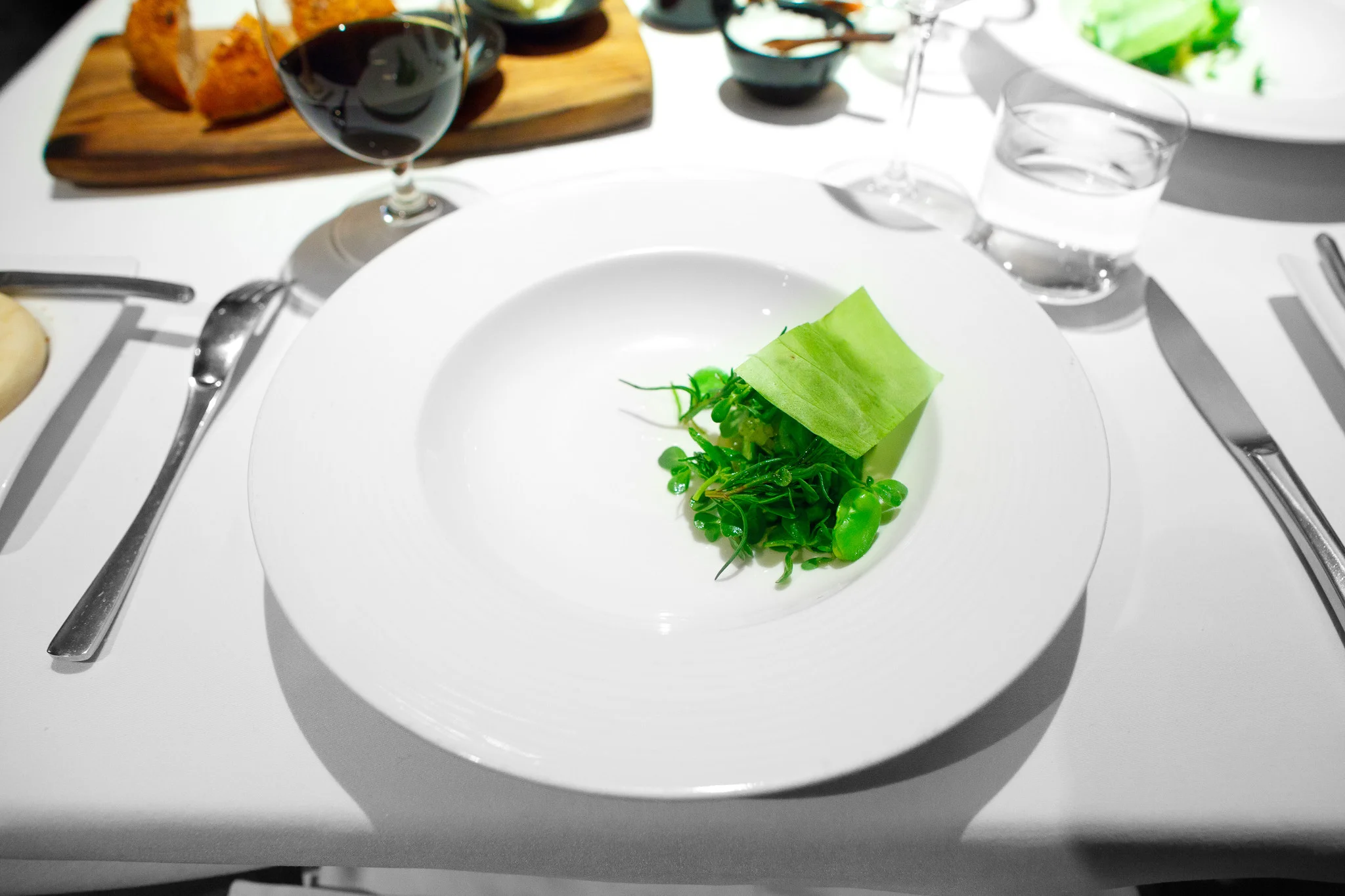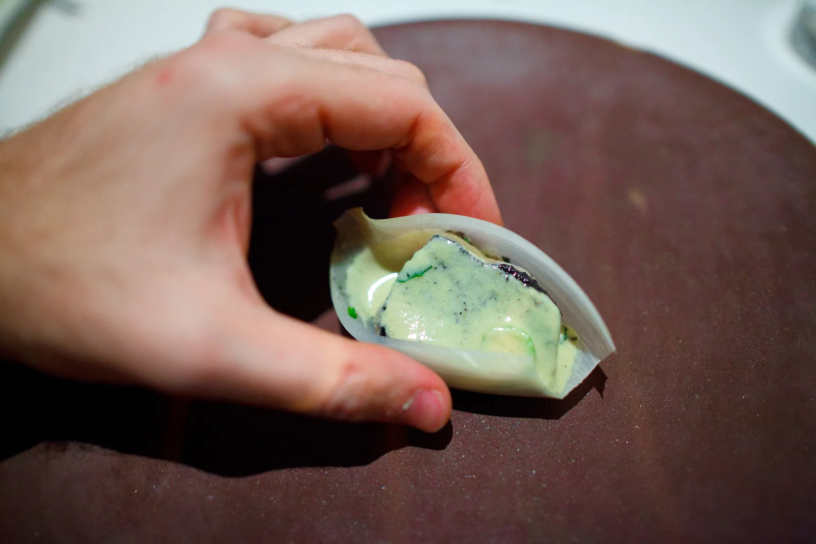 In a minimalist version of the garden dish, ensalada de nopales, Chef Olvera explores acidity and herbal freshness coming from the nopal cactus (served fresh and dehydrated) sweetened with green pea shoots.