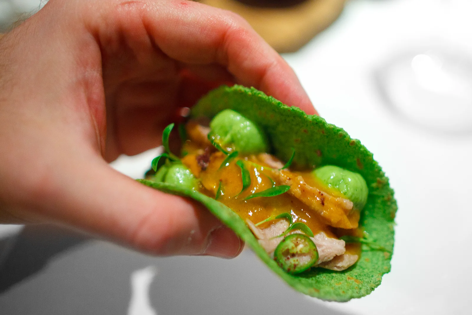 Barbacoa slowly cooked for 24 hours, avocado cream, poblano pepper tortilla, serrano chile
