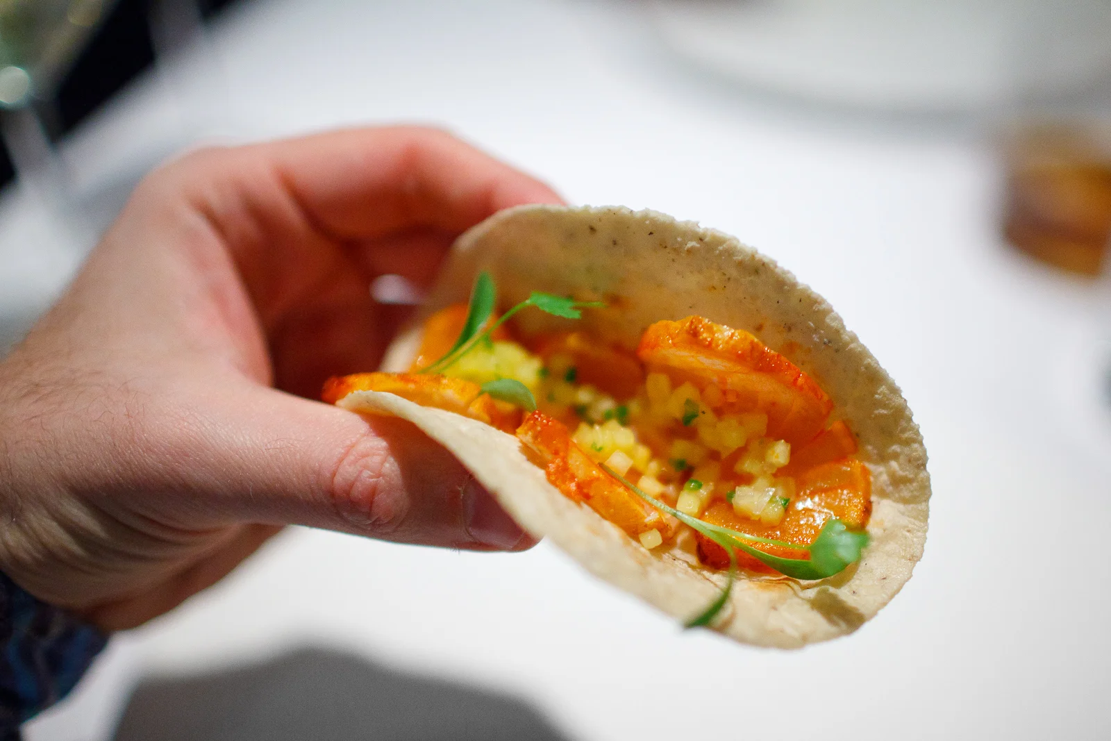 If Mexico City had an official dish it would likely be tacos al pastor, the Mexican version of doner kebab kicked up with pineapple and cilantro. Served on rotating spits throughout the city, sheets of pork and pineapple are shaved off in one fell swoop into a corn tortilla. It's a heavy dish in which the tortillas are sometimes dragged through a layer of dripping pork fat before stuffed with pork. Chef Olvera's version is clean and lacks visible oil, where pork is replaced with snook.