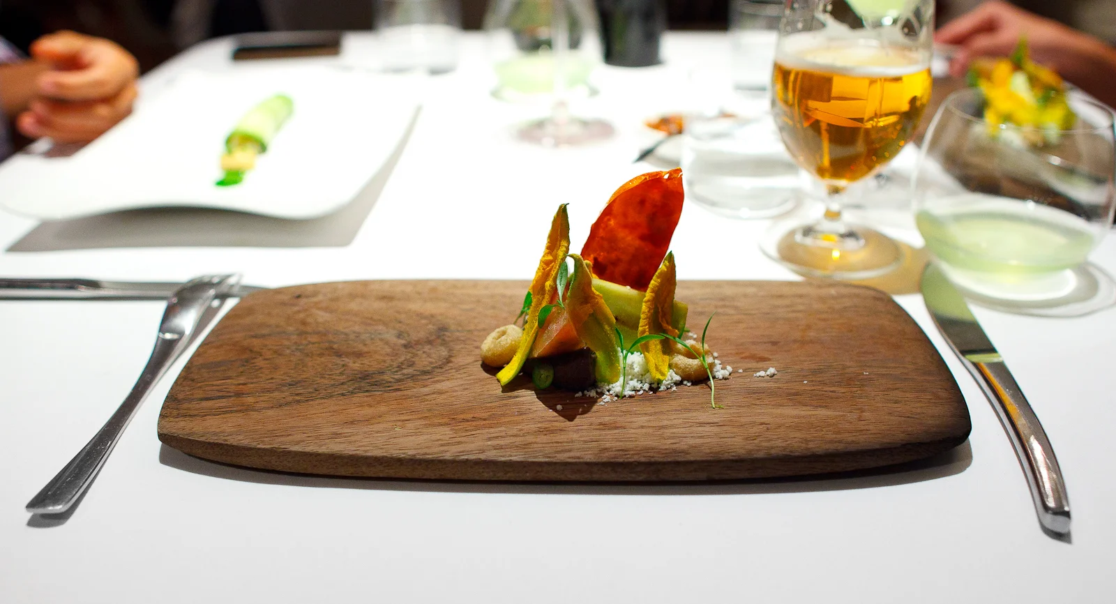 La Milpa, literally translated as "the cornfields," is the place where the vegetable foundation of Mexican cuisine begins. " Chef Olvera pays tribute with a wooden slab holding colorful local squash, zucchini blossom, jumiles, pipicha oil, and small tomatoes. Binding the dish together are puréed beans and fresh cheese.