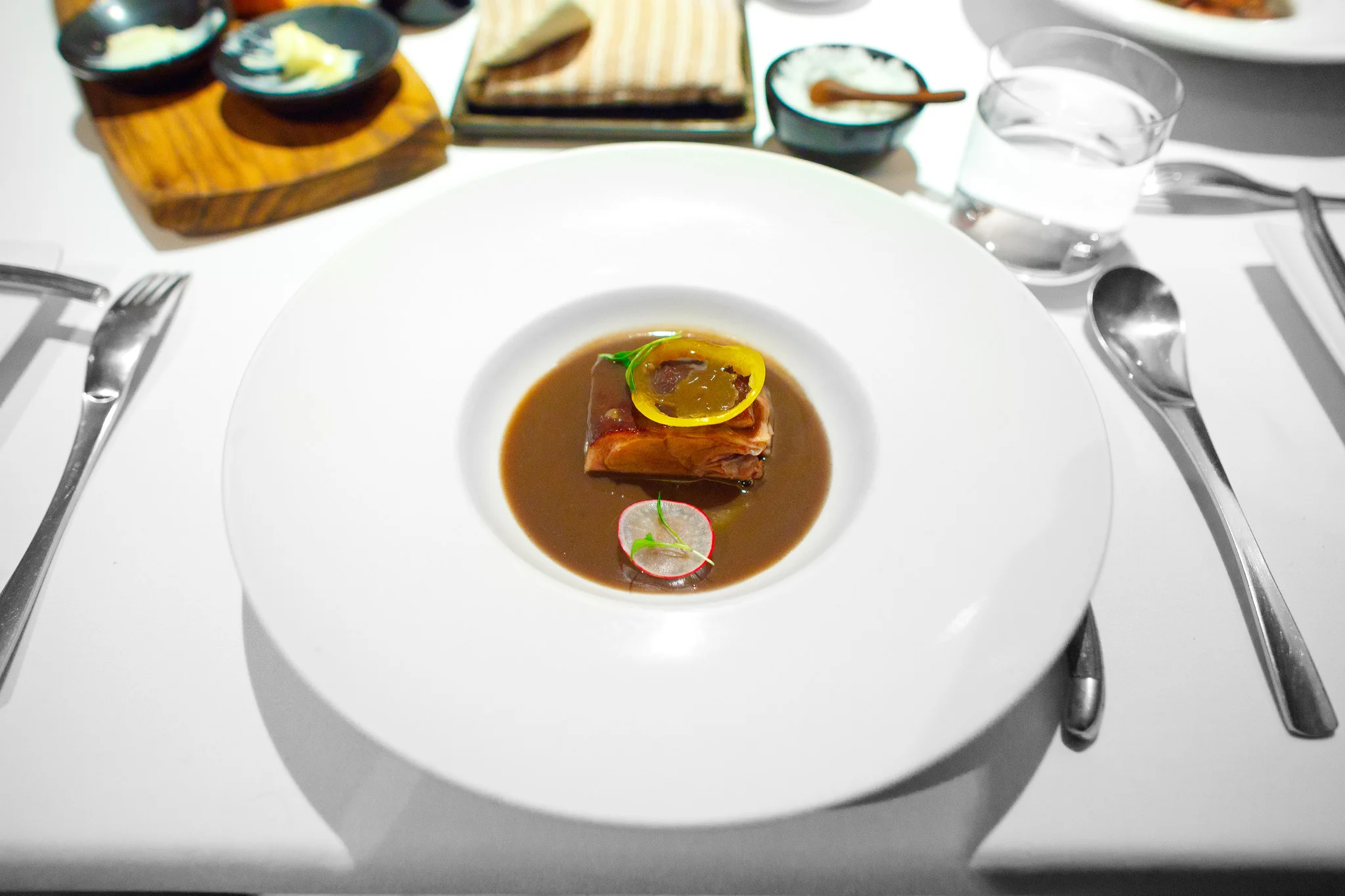 Barbacoa tacos, a central Mexican dish of sheep slow-roasted in deep pits underground, is enhanced at Pujol with an avocado cream, spicy serrano chiles, and a poblano pepper tortilla. The sheep is very carefully slow-roasted for 24-hours producing a succulent, concentrated cut of meat. This is a dish that frankly, is tastier than any street version I've had.