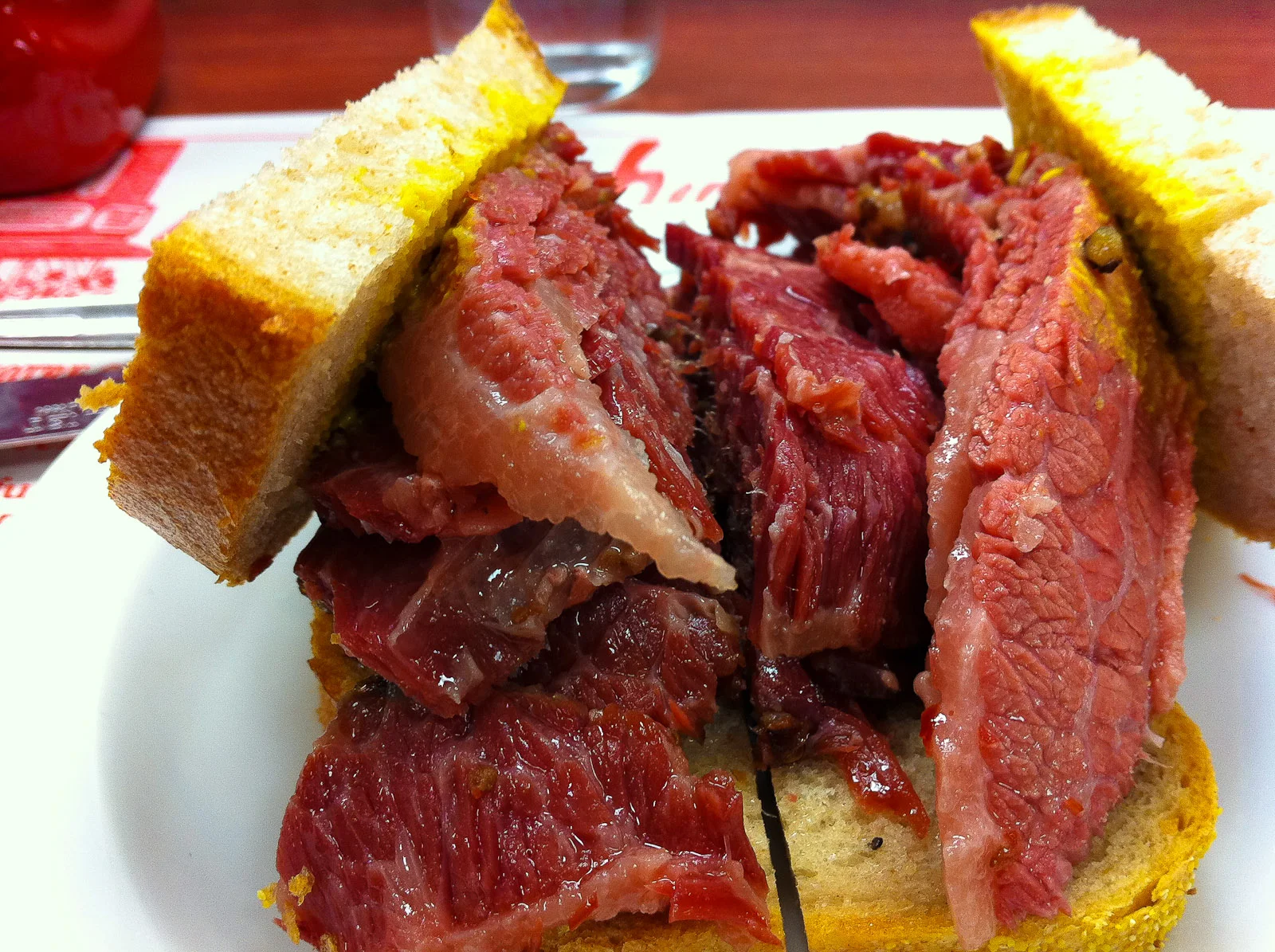 The dry-cured meat, generously rubbed in coriander, allspice, salt, pepper, and other "secret spices" is smoked fresh daily after being marinated for ten days. The meat is hot all day since its density locks in the heat and moisture for hours. The flavor is peppery with a subtle sweetness that develops from the curing process. Extra fat is absorbed by the bread, almost like the hand of god covertly spread butter on each slice when I wasn't looking.
