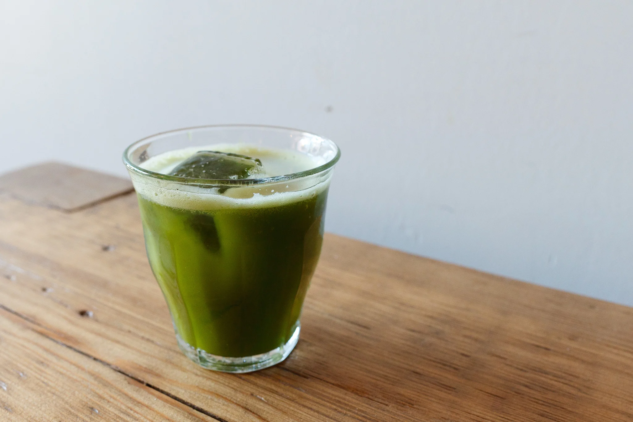 Iced matcha tea - A concentrated shot of unsweetened whipped matcha tea with oversized cubes of ice. This is absolutely delicious; its flavor is grassy and bright.