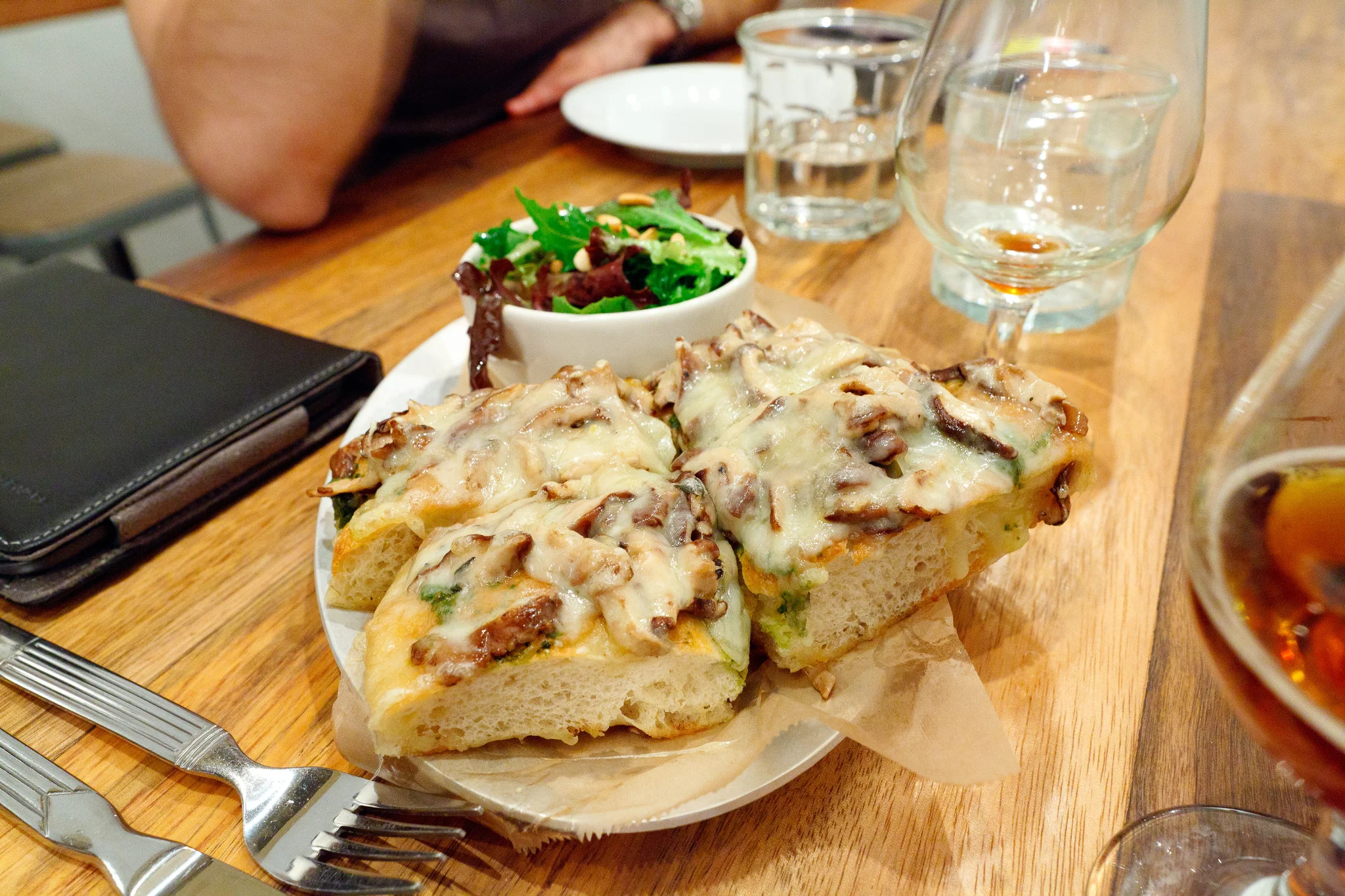Fontina Val d'Aosta - An open-face sandwich of marinated mushrooms and basil pesto on focaccia. A cheesy, earthy blend of mushrooms and pesto with a semi-firm Italian cow's milk cheese atop a springy focaccia. The cheese itself is woody which pairs really nicely with the mushrooms. This is one of my favorite sandwiches on the menu.