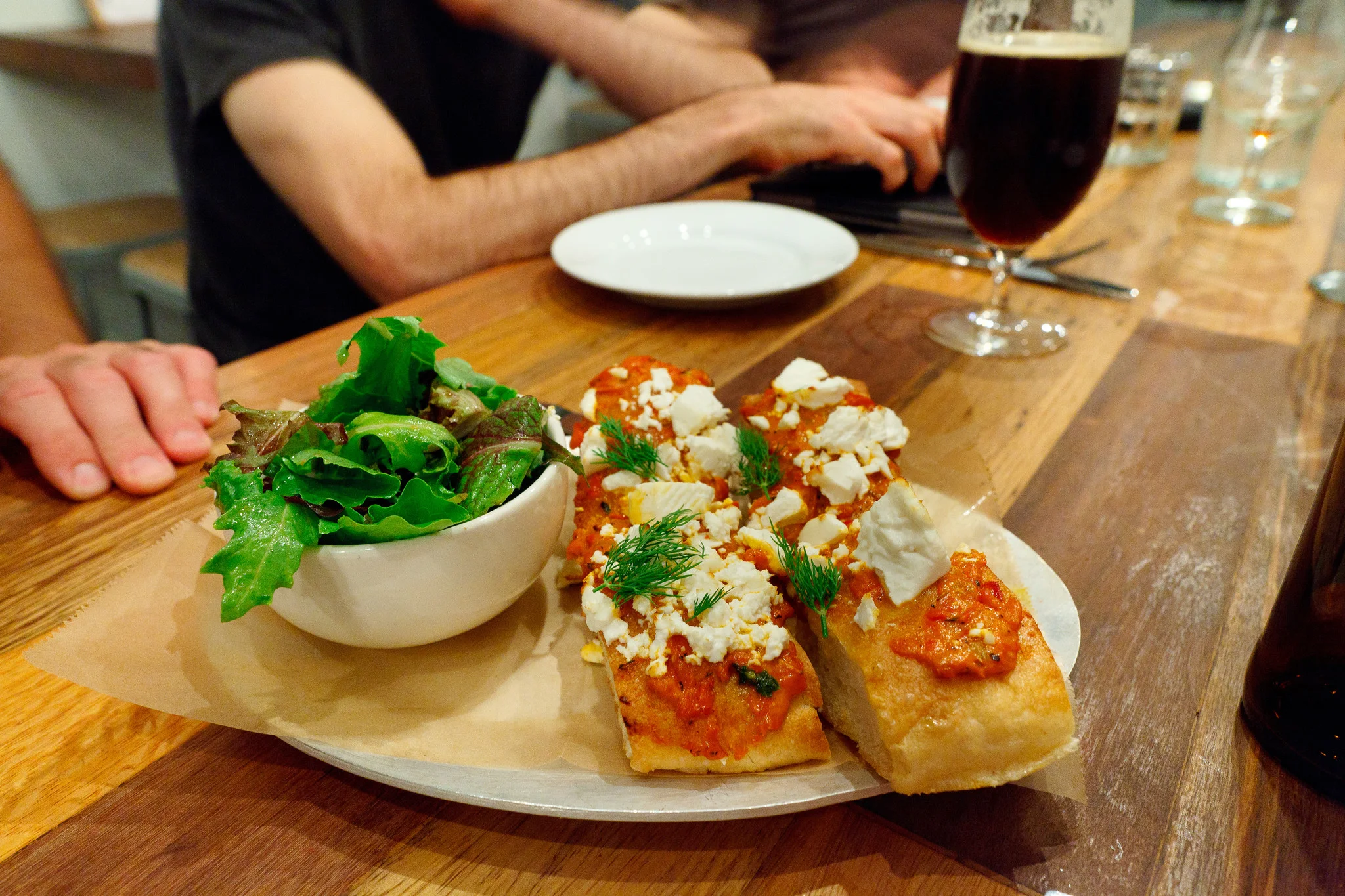 Arahovas Feta - An open-face focaccia topped with feta, red pepper, and dill. A lighter sandwich with minimal saucing, led by the frutiness of the red pepper spread.