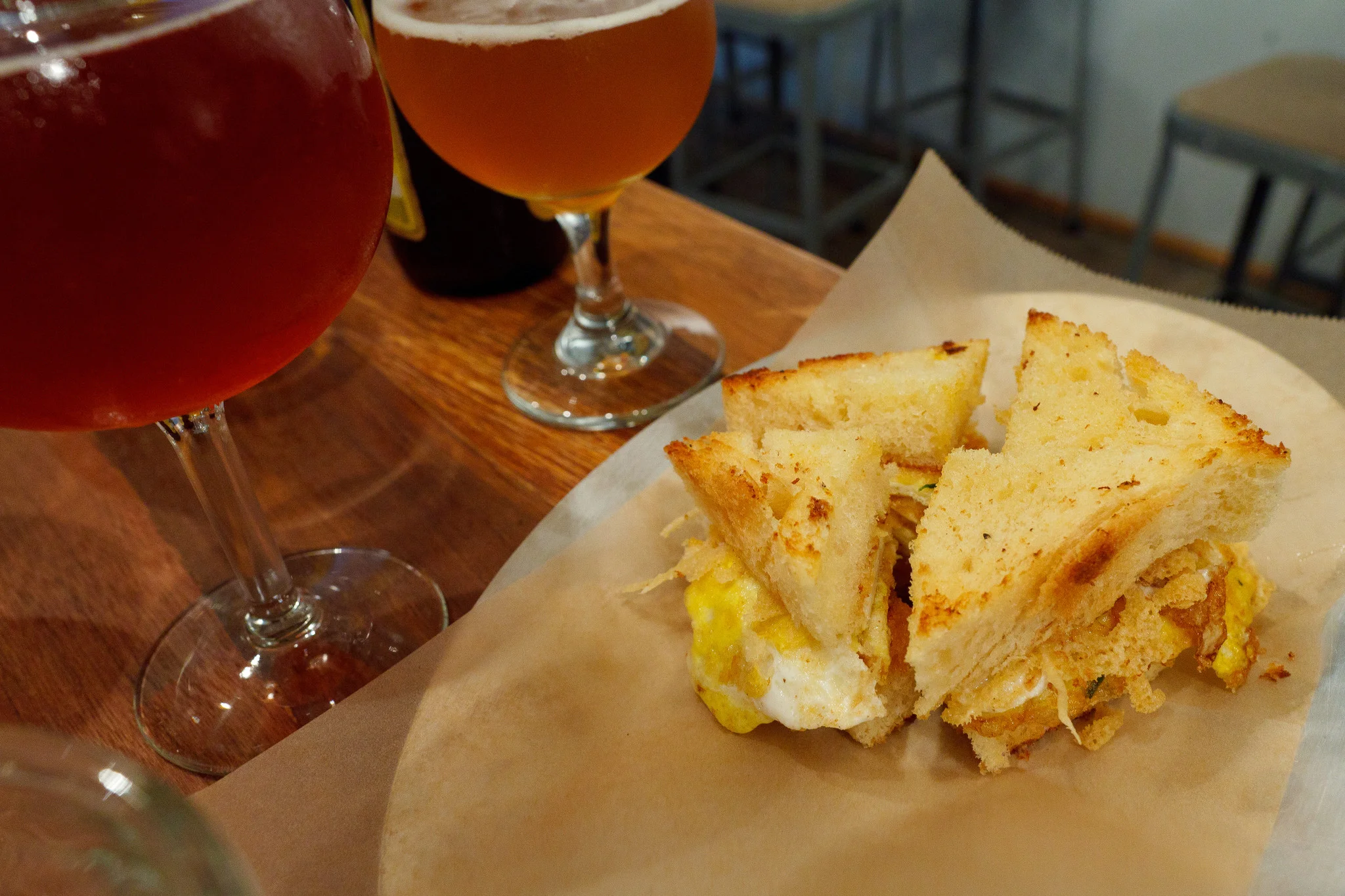 Egg & cheese - A morning favorite. Thick slices of crustless, buttered brioche sandwiching egg, ricotta, and gruyere with thyme and a maple hot sauce. The balance of sweet, spicy, and salty combined with the umami from the cheese makes this a great sandwich.