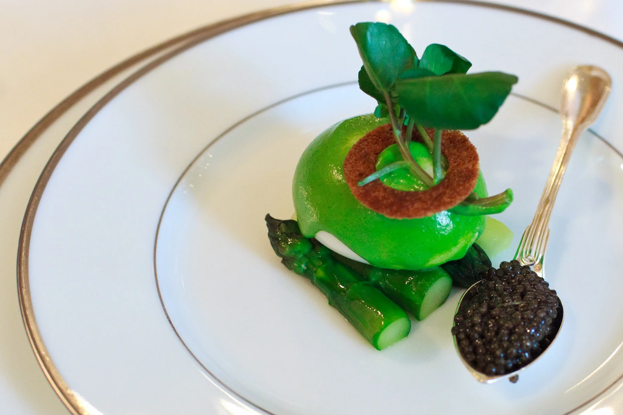 Chaud-froid d'oeufs mollets au cresson, asperges vertes et caviar osciètre gold - Two lightly poached eggs garnished with asparagus, watercress, and golden ossetra caviar. The cold briny caviar cuts right through the warm and thick yolk, leaving behind a constantly changing whirlwind of flavors up until the last bite.