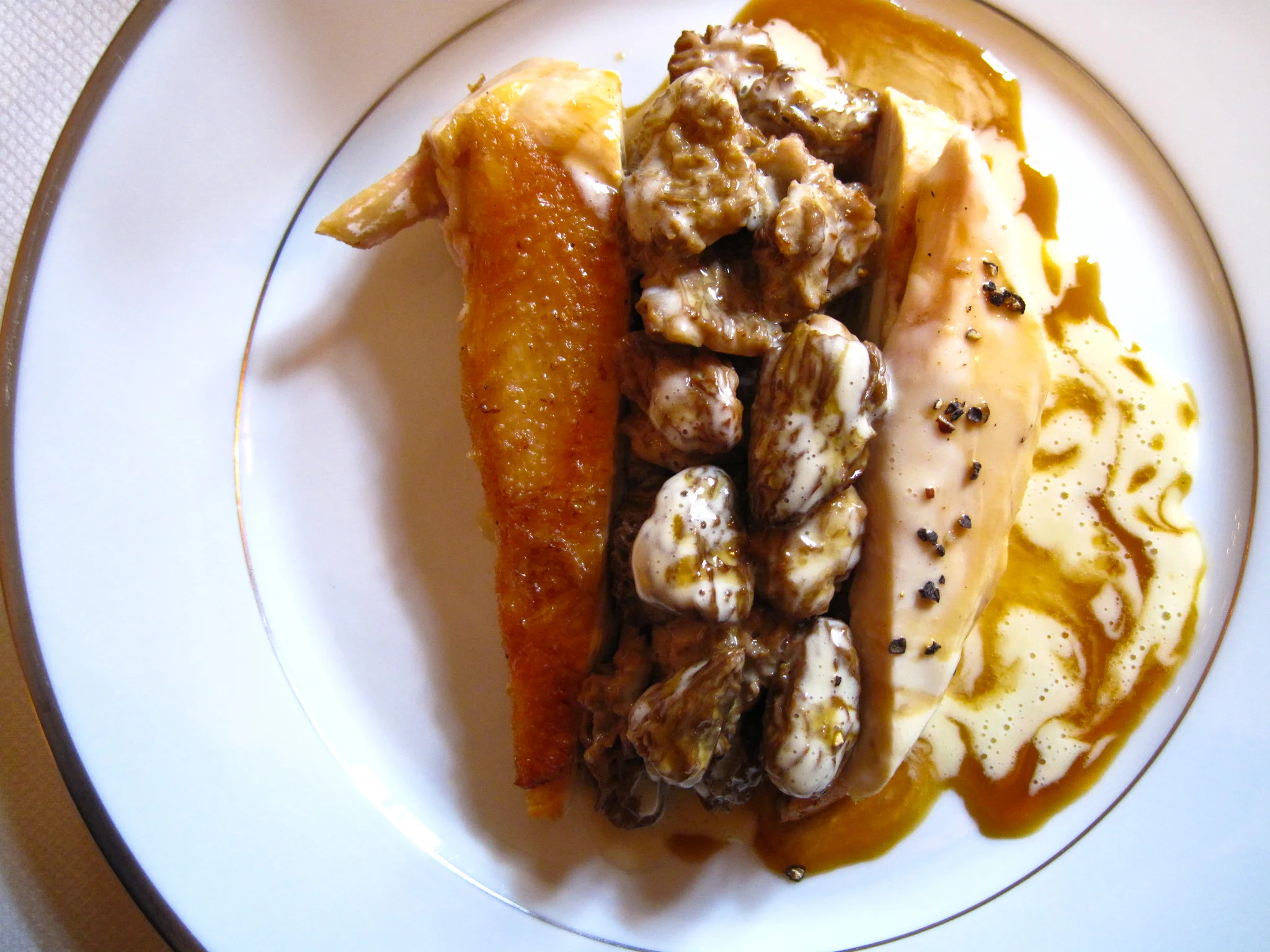 Supreme de volaille de Bresse aux morilles - A lightly cooked Bresse chicken filled with morel mushrooms and a mix of a white wine cream sauce and jus. The chicken is ultra-moist, the sauces are more to compliment the spongy texture of the squeaky morel mushrooms.