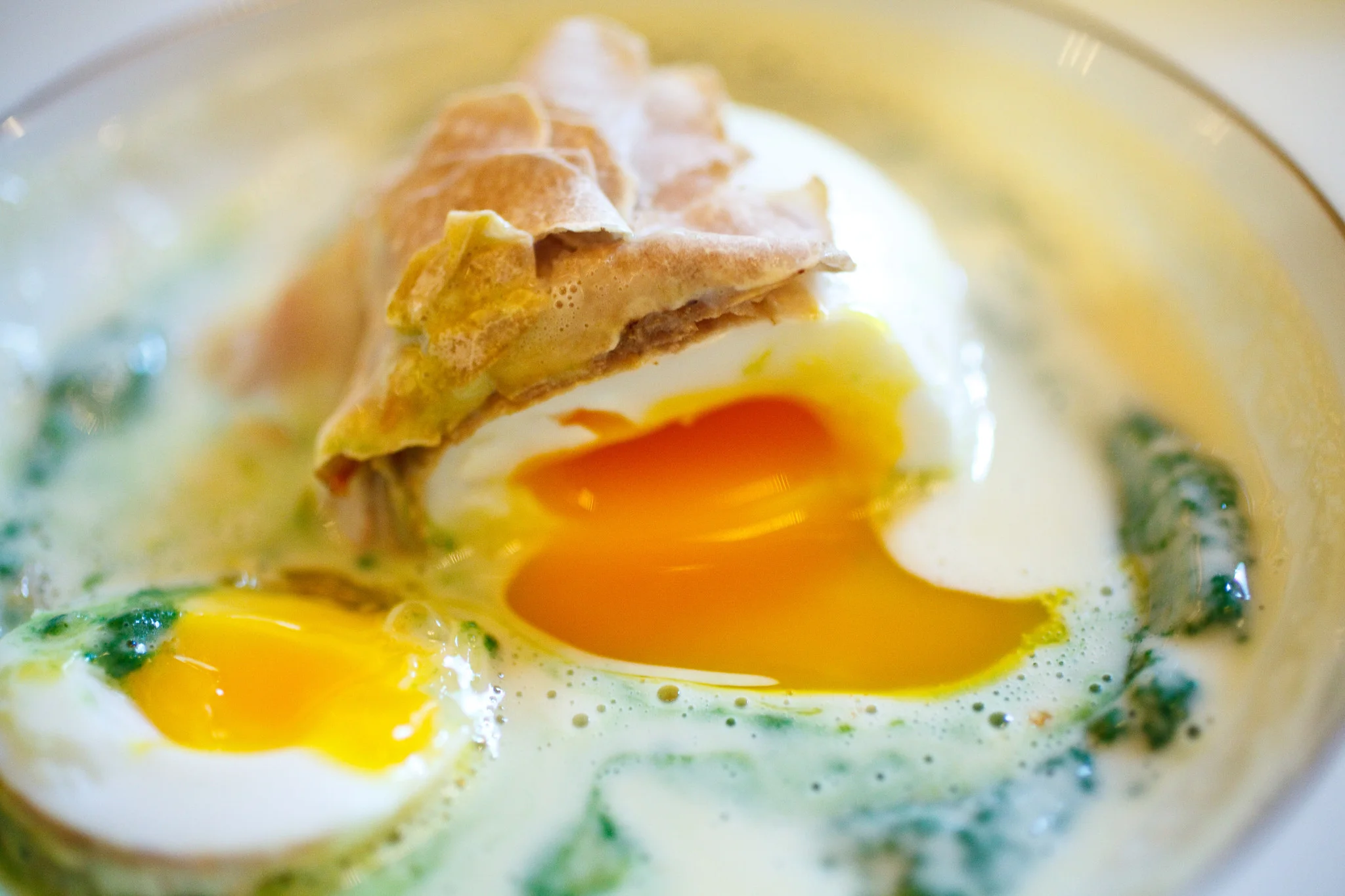 Chaud-froid d'oeufs mollets au cresson, asperges vertes et caviar osciètre gold