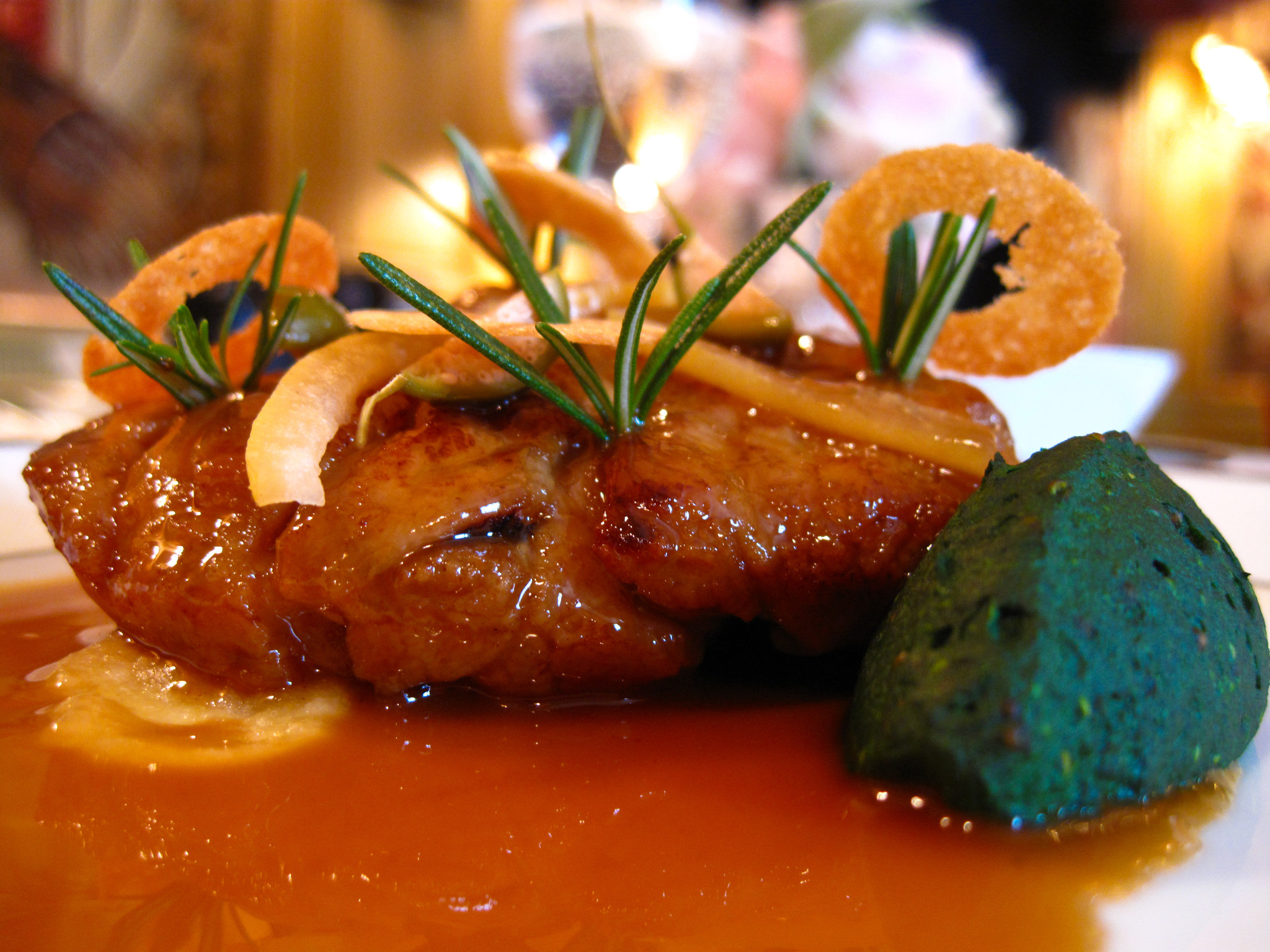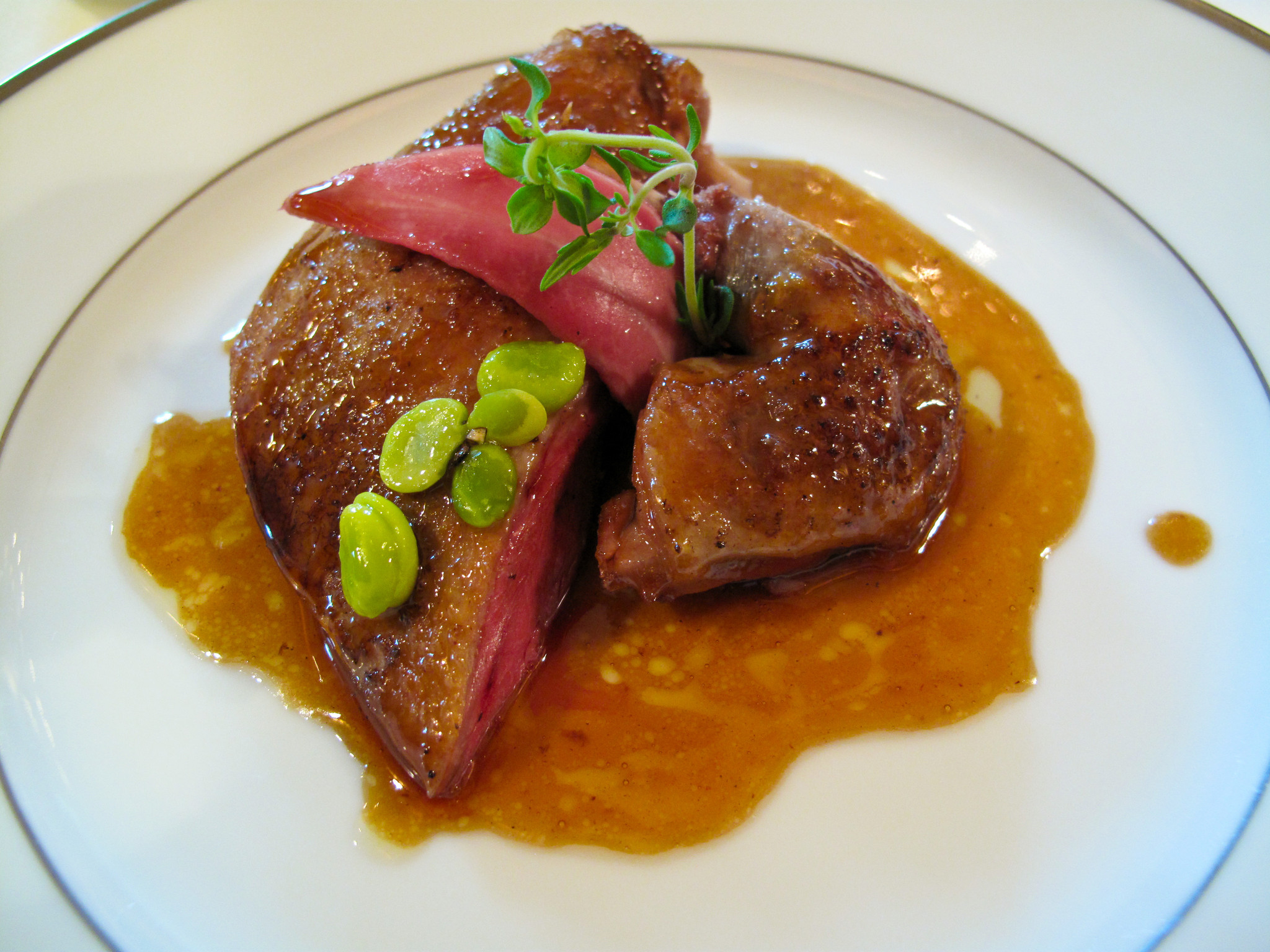 Lobe de foie gras de canard roti, navets primeurs a la reglisse - A lobe of duck foie gras with spring turnips cooked in liquorish. It's amazing how the flavor of foie gras changes so dramatically when served cold in a paste, or cooked as a filet. Here the fatty oil oozes out, tempered by the cool sweetness of the liquorish. It's an exquisite dish, though quite heavy.