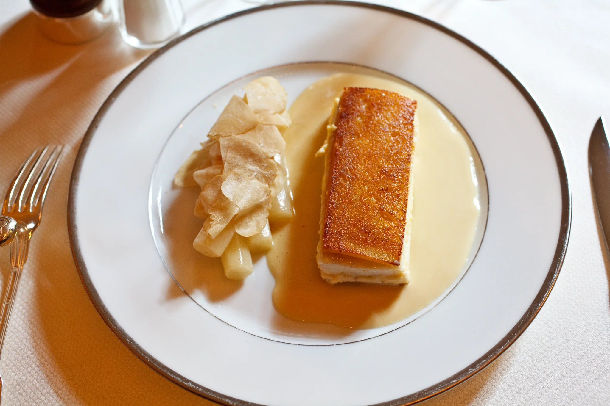 Viennoise de dos de sole meunière, salsifis à la truffle blanche d'Alba - During white truffle season, Pacaud serves the classic sole meunière, only instead of morel mushrooms he serves it alongside white asparagus and a dusting of layers of white truffle.