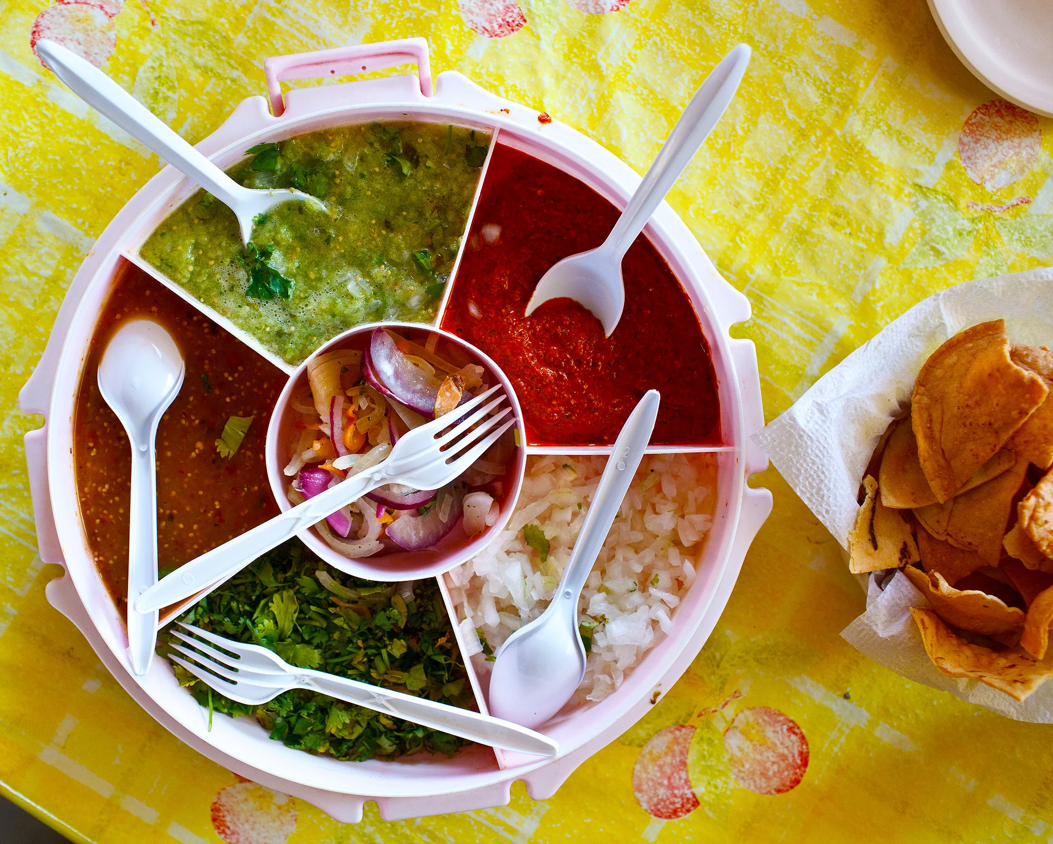 Accompaniments for the borrego - Green salsa, red salsa, diced onions, cilantro, salsa with chipotle, and habanero pepper and onions. These vibrant raw sauces and vegetables cut through the fatty mouthfeel of the meat while adding vegetal freshness and spice.