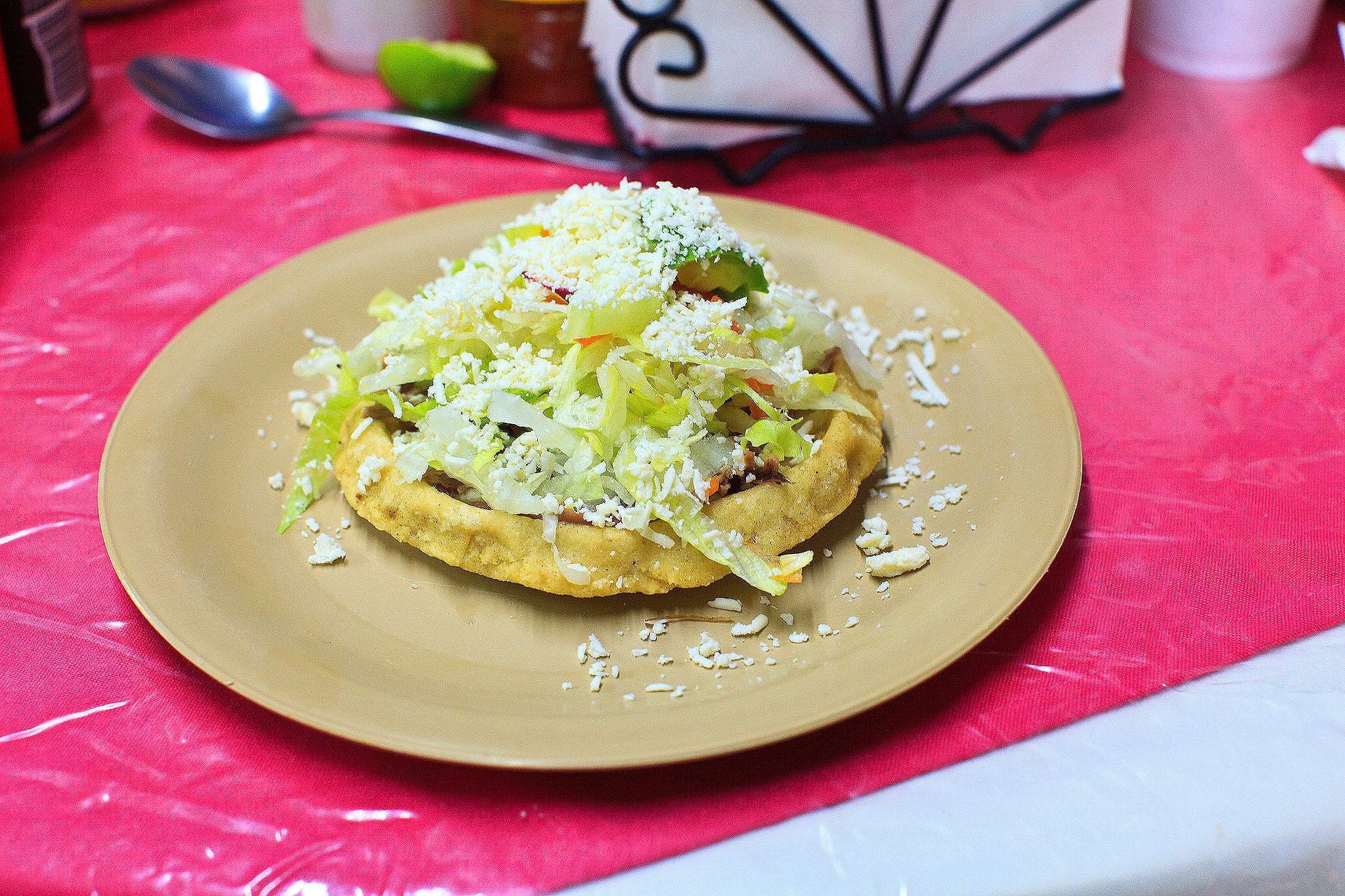 Sopes de pollo y de carne deshebrada - Thick puffy corn tortillas topped with lettuce, tomatoes, red onion, avocado, beans, and a cream sauce. One has hand-pulled chicken and the other, beef. The texture of the sopes (otherwise known as "gorditas," an affectionate word for a chubby girl) is phenomenal: stubby discs of masa that are simultaneously crispy and chewy, depending on which part of the griddle-cooked dough is eaten. Some locals take advantage of the dough's absorbency by ordering beef-stock consommé and pouring it over to fill the airy crevices.