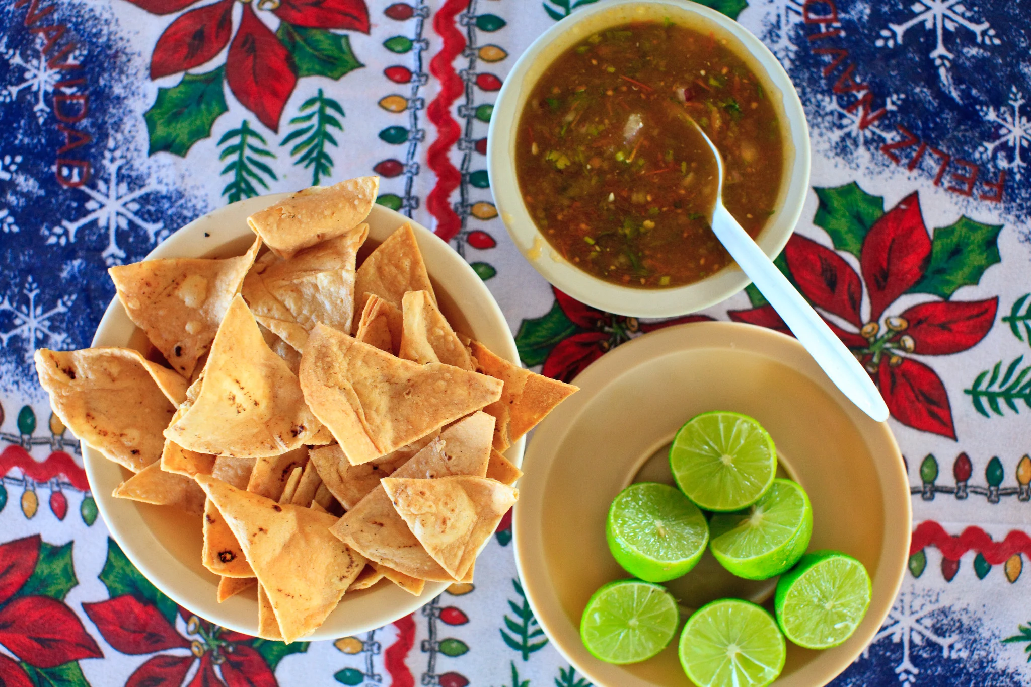 Totopos con salsa y limón - Corn tortillas with salsa and Mexican limes. A sprinkle of salt is all these chips need.