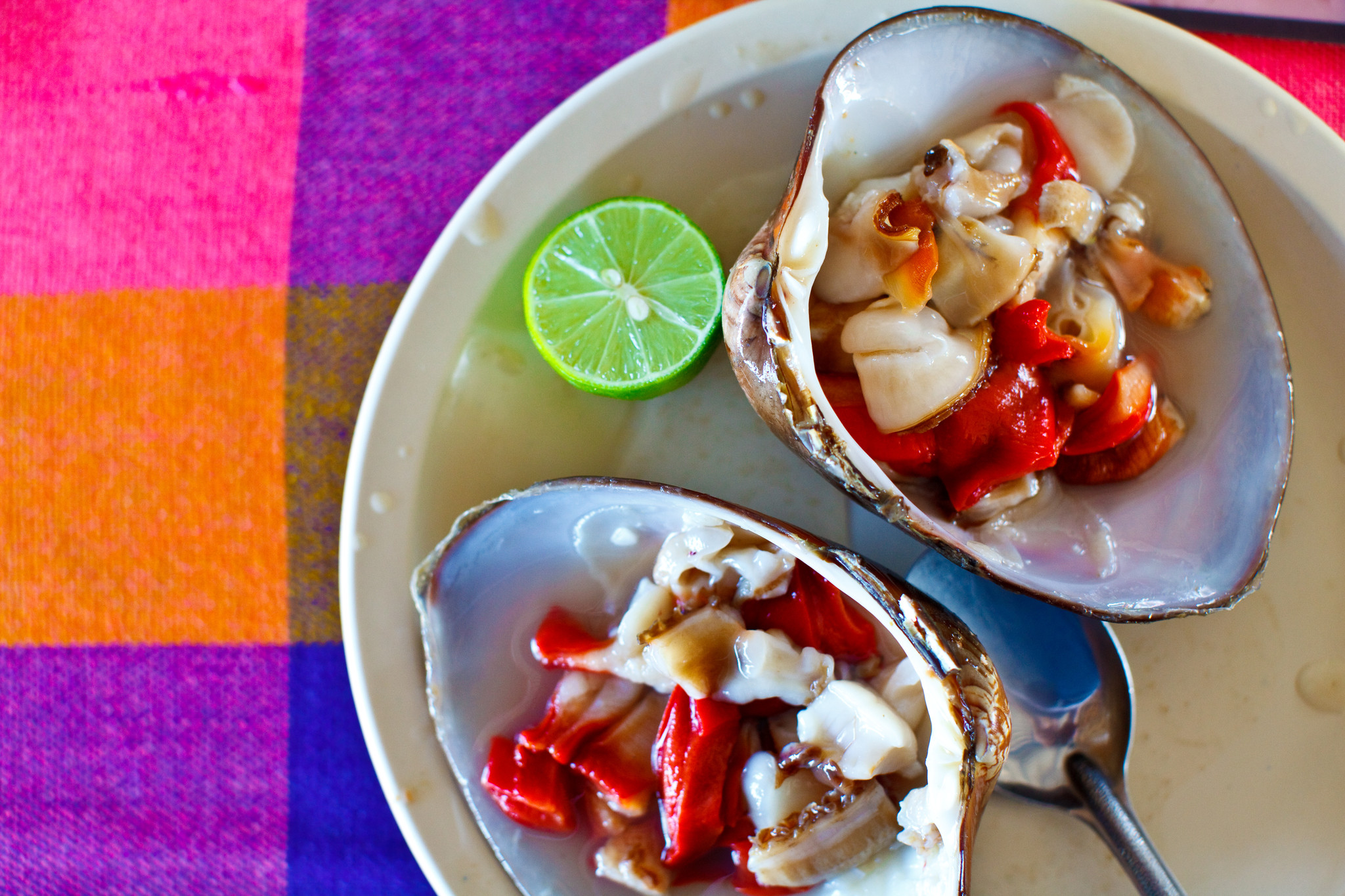 Almejas chocolatas - A generous squirt of fresh lime and the live clams contract. Don't eat the clams unless they move -- which they almost always do -- as it's a sign of freshness. These meaty clams are intense in mineral flavor, and with a splash of lime and drop of Nayarit's very own Salsa Huichol, they become light, spicy, and fresh.