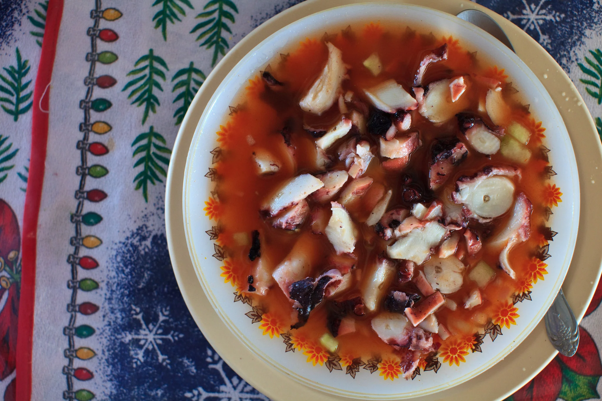 Cocktail de pulpo - Lightly cooked octopus with cucumber and tomato in a chilled seafood broth.