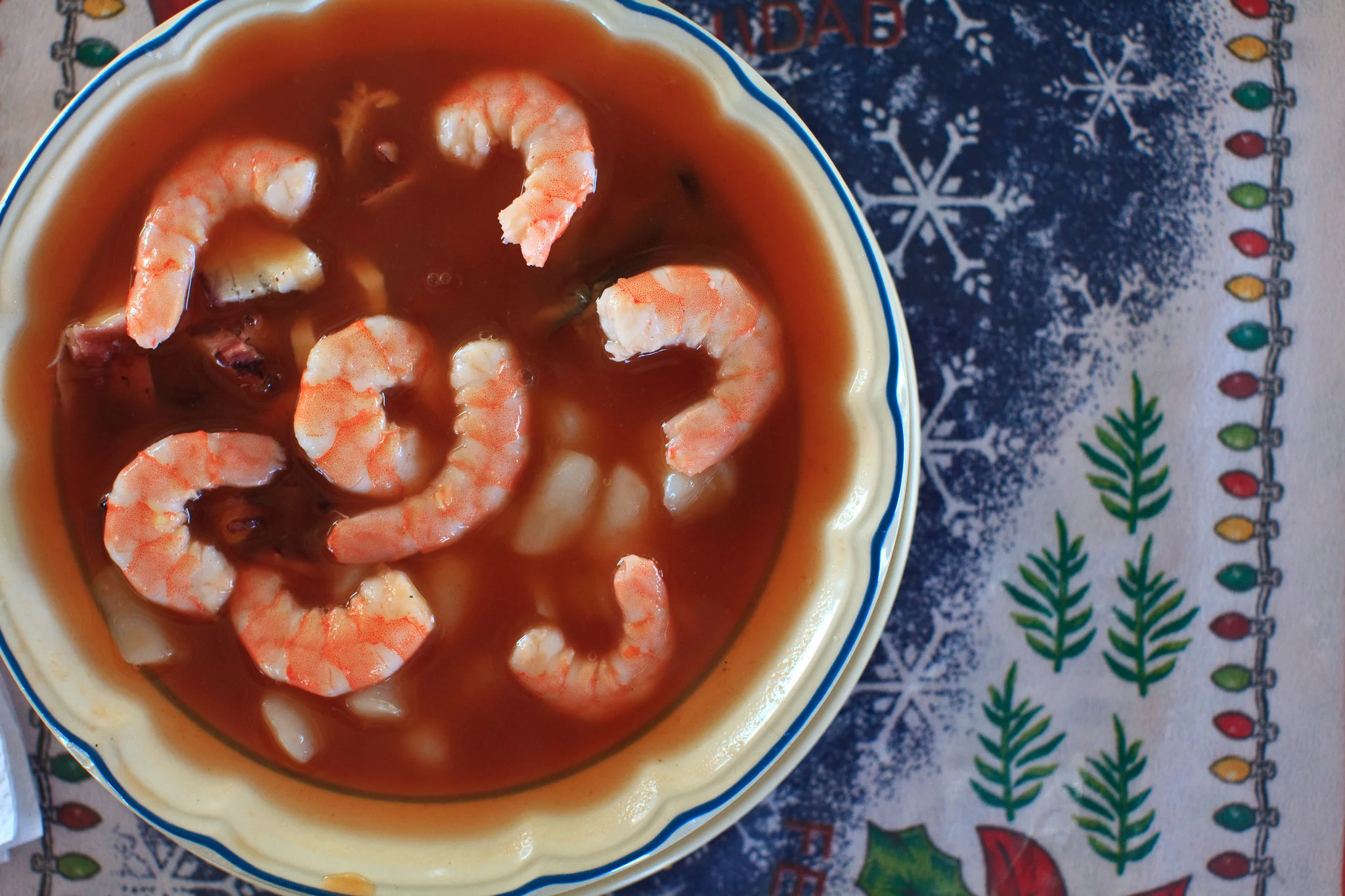 Cocktail de Camarones, Callo de Hacha, y Caracol - shrimp, scallop, and snail in a cocktail broth.