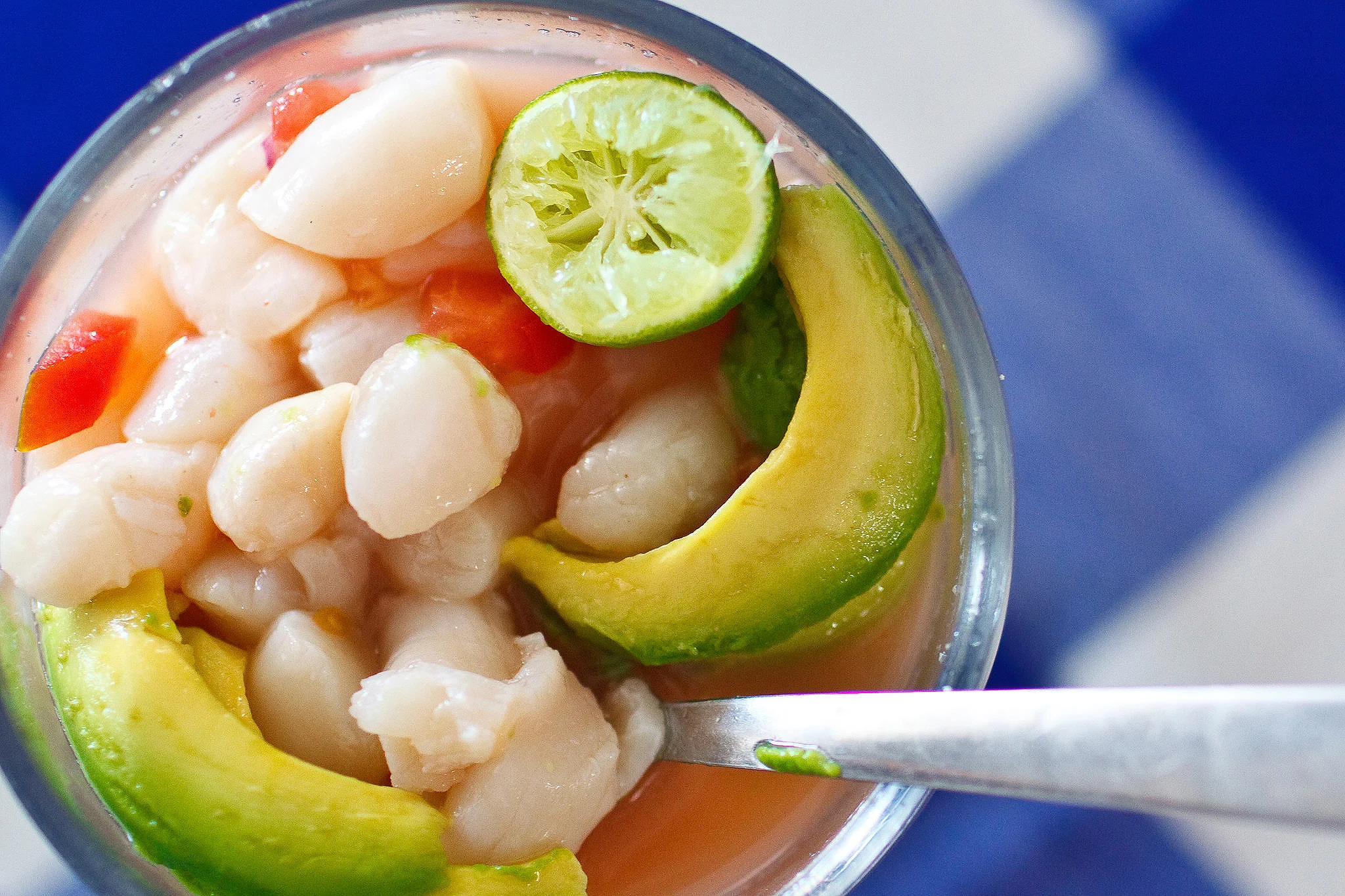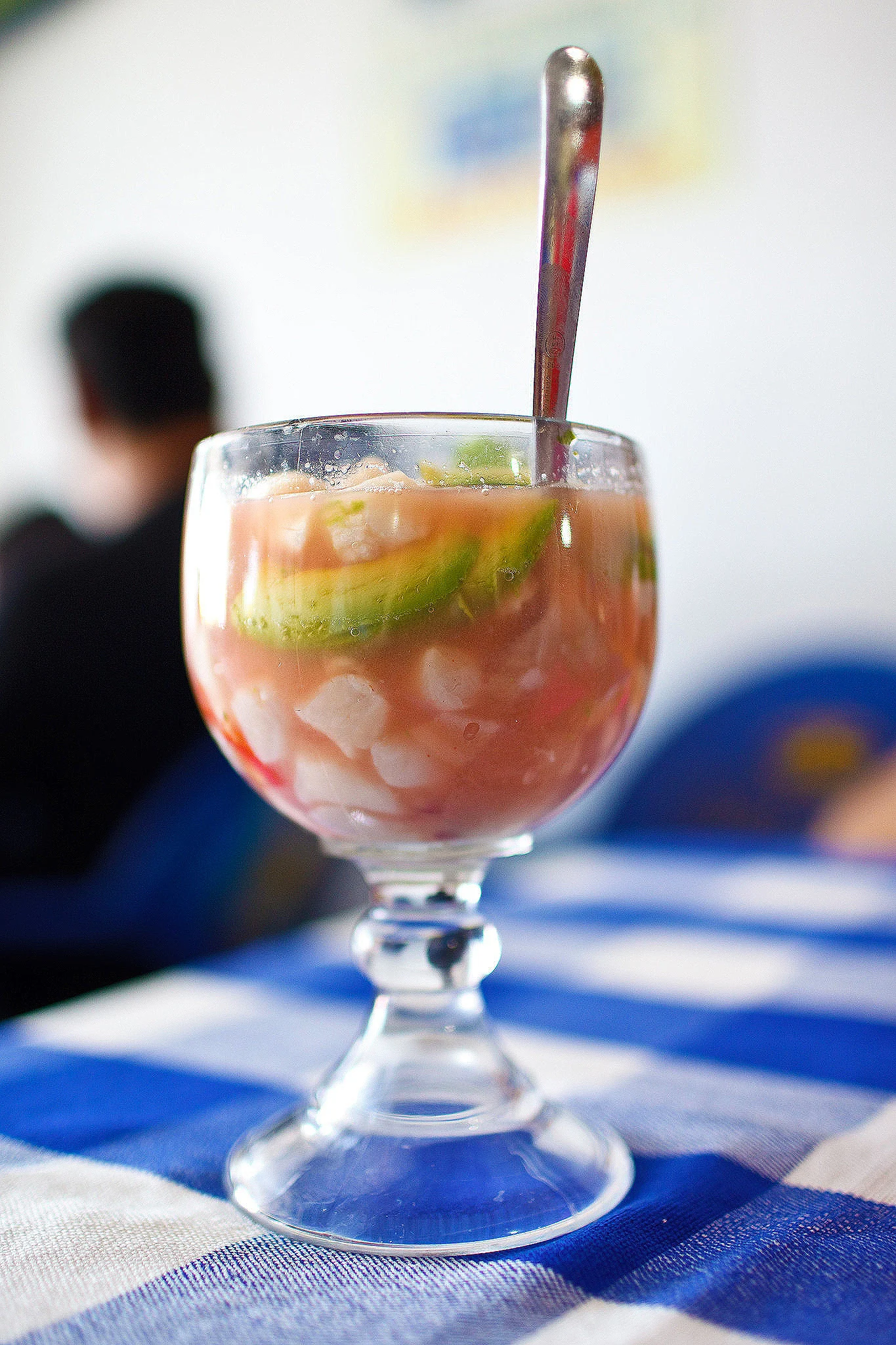 Cocktail de Callo de Hacha - Raw scallops, tomato, avocado, cilantro, and lime in a goblet filled with chilled shellfish broth. Served with crispy corn totopos to add some textural contrast.