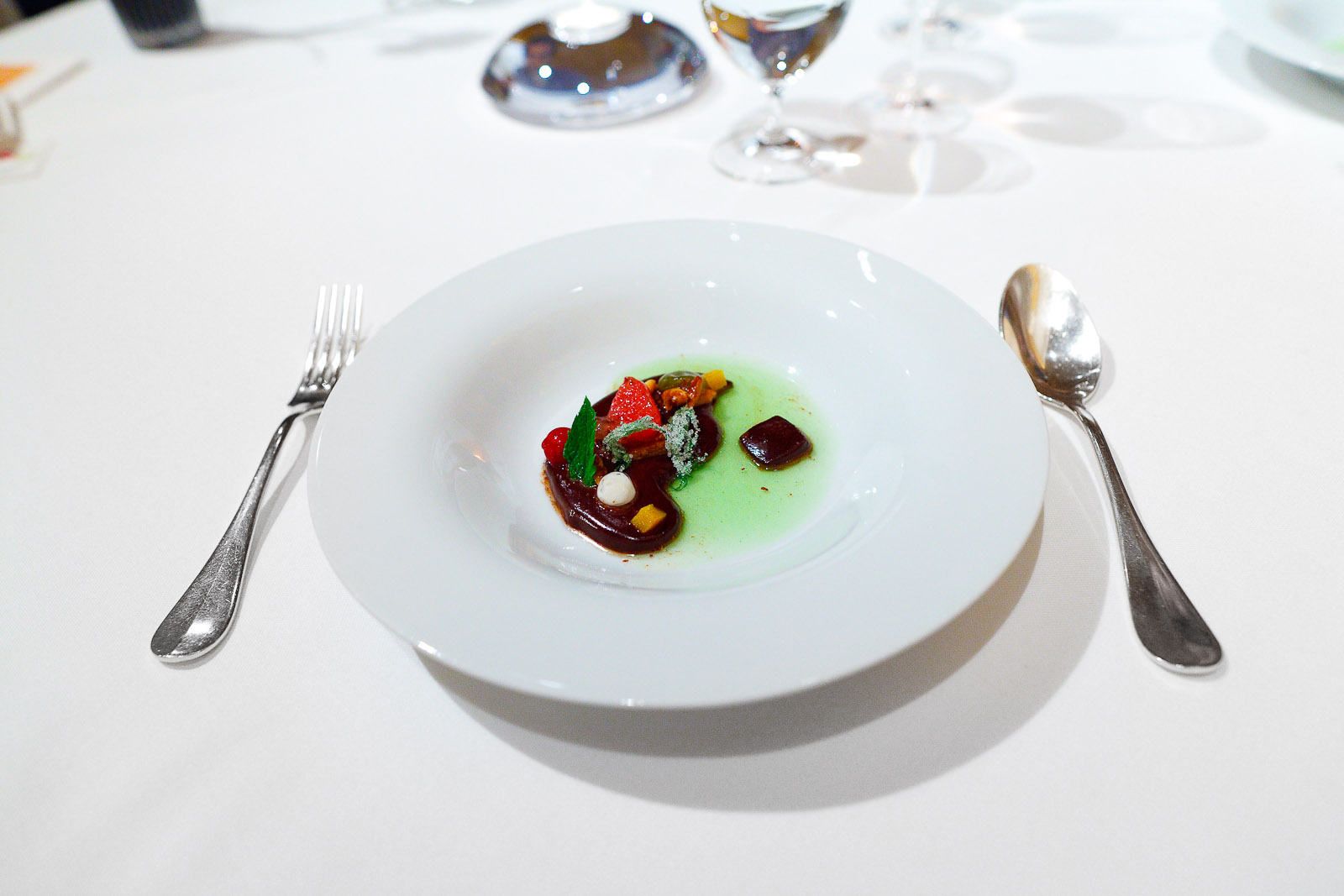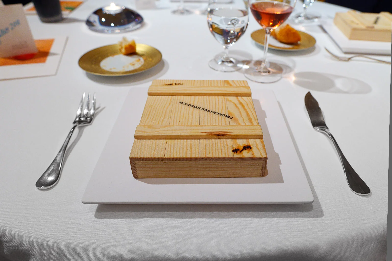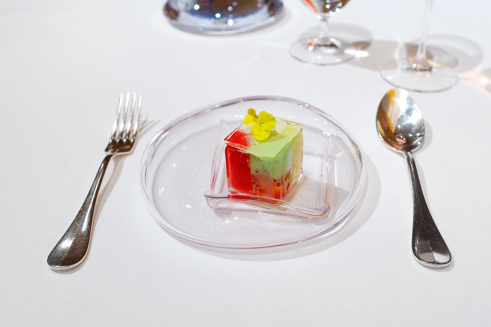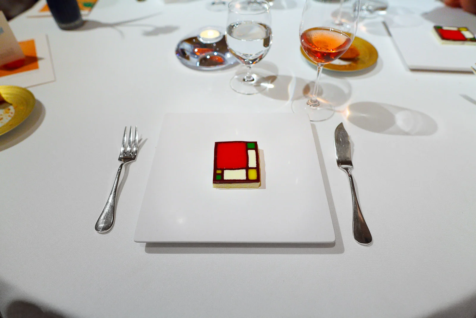 Gastronomic Mondrian - Our first course was presented as a protected work of art, shipped from the kitchen to our table.