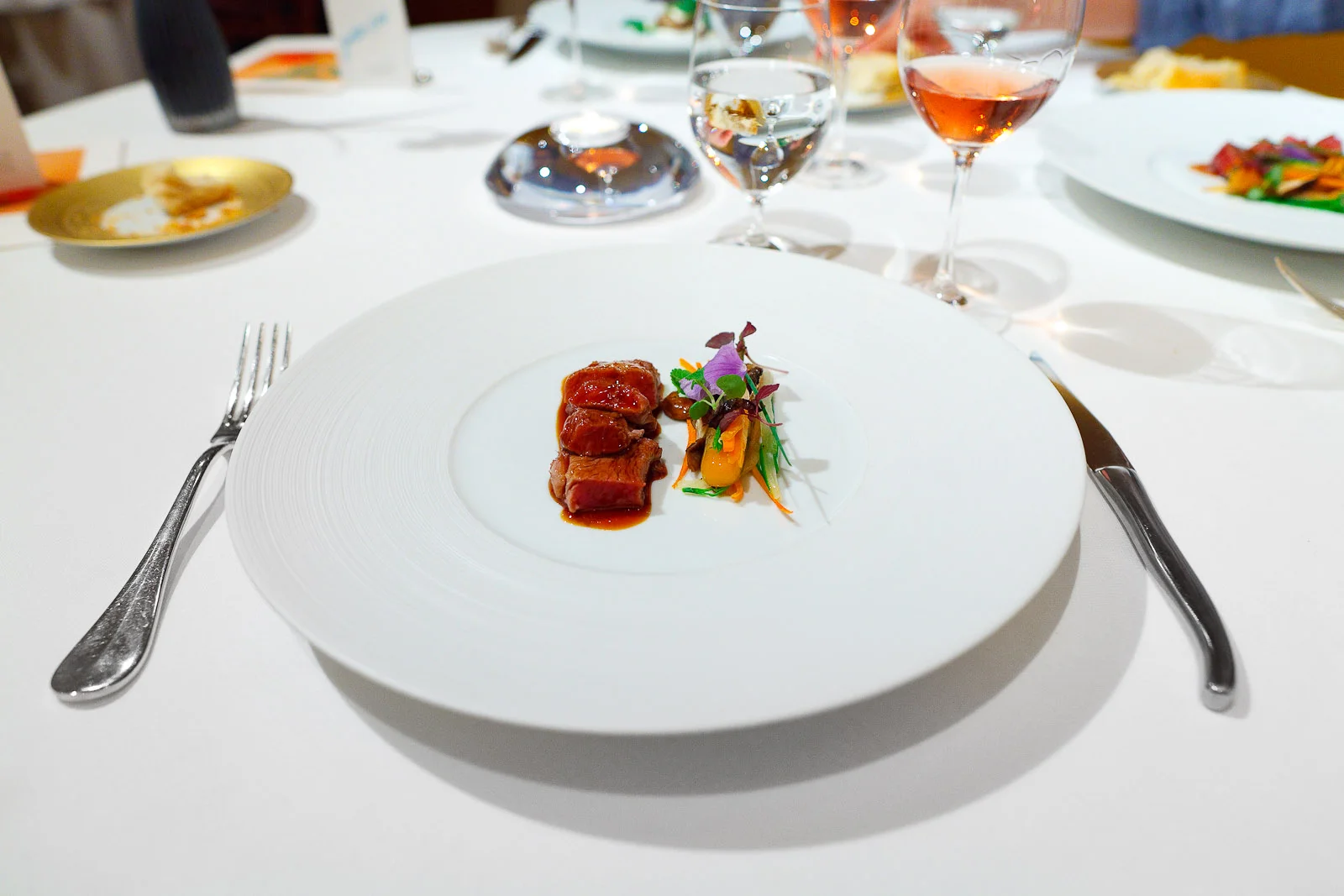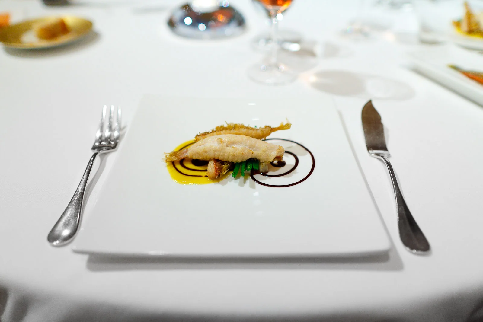When the wooden crate was lifted, a gorgeous work of art stayed behind. We were served a cod brandade with red, green, and yellow pepper squares, piped with black olive borders. When mixed the flavor was delicious: lightly salted cod mixed with sweet peppers alongside a mild acidic bite from the olives. The flavor of Spanish olive oil from the emulsified cod was particularly fruity, brought out by the sweet peppers. I loved this dish.