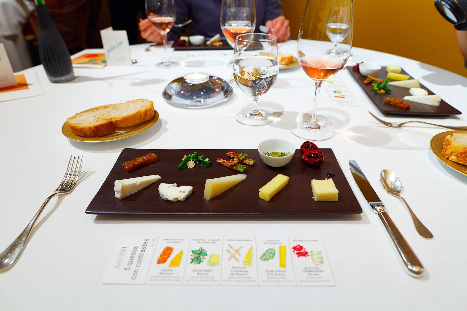 Cheese course: Ordre, peach with sweet wine - Bichonnet, cordifole, almonds, vinaigrette - Payoyo, pepper bread sticks - San Jorge, courgette preserve - bleu de termignon, bigarreau cherries with vodka