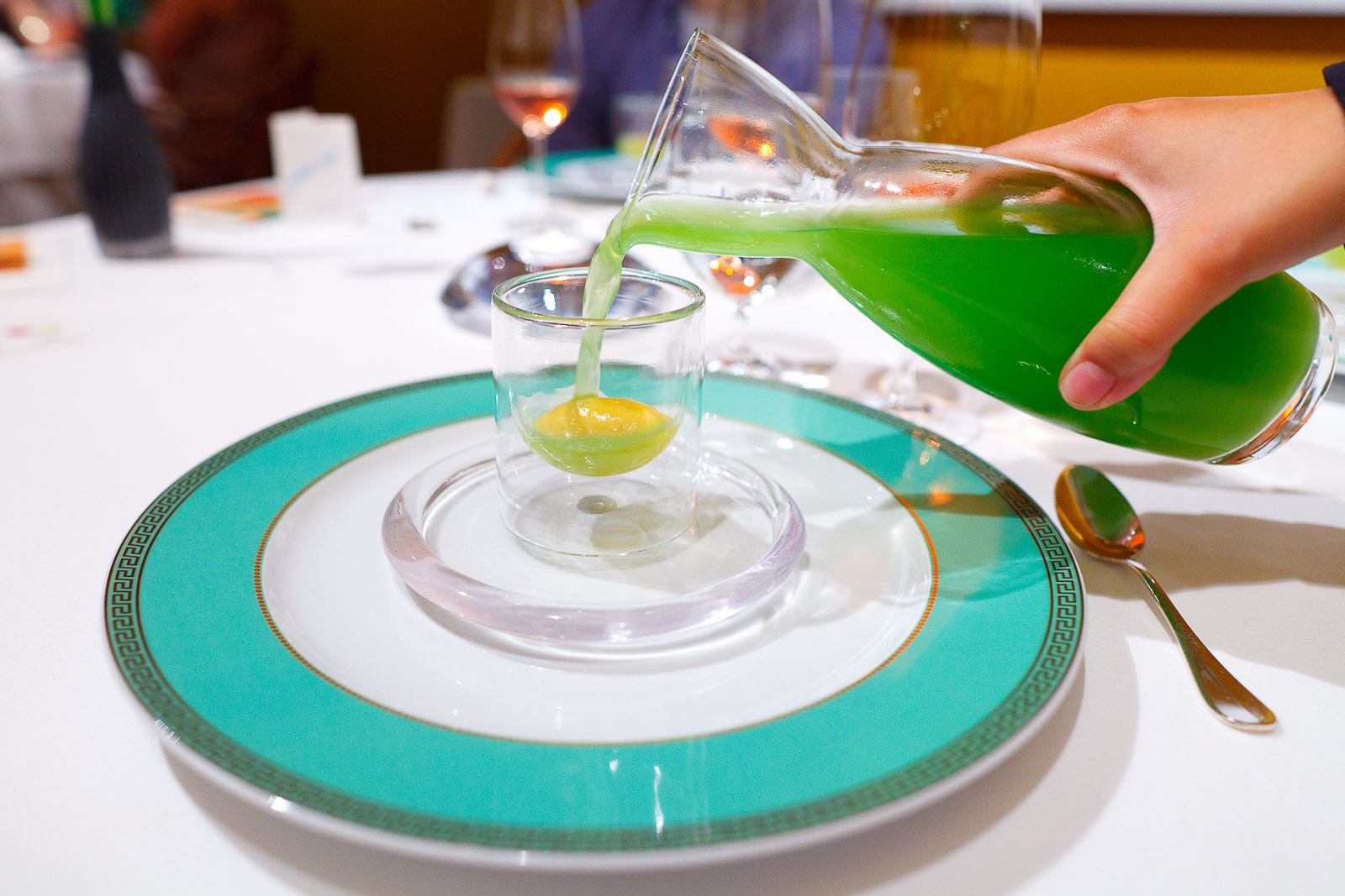 Refreshing infusion - A basil-infused water poured over a peach sorbet. The basil water had no sweetness whatsoever. Its simple and pure taste was similar to our first course, the pesto "starter broth." Chef Ruscalleda has a masterful understanding of sweetness, and how to apply it carefully. The sorbet was only mildly sweet, but as it mixed with the unsweetened basil water its subtle sweetness became apparent. This course was refreshing indeed.