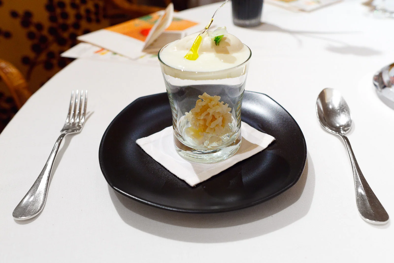 Blanc - White chocolate, rice, lemon verbena, gin, olive oil, and yoghurt in a glass. The white chocolate cap suspended the lemon verbena sorbet. When cracked, the ingredients mixed together. The rice added an earthy grain component that helped temper the acidic bite of the sorbet.