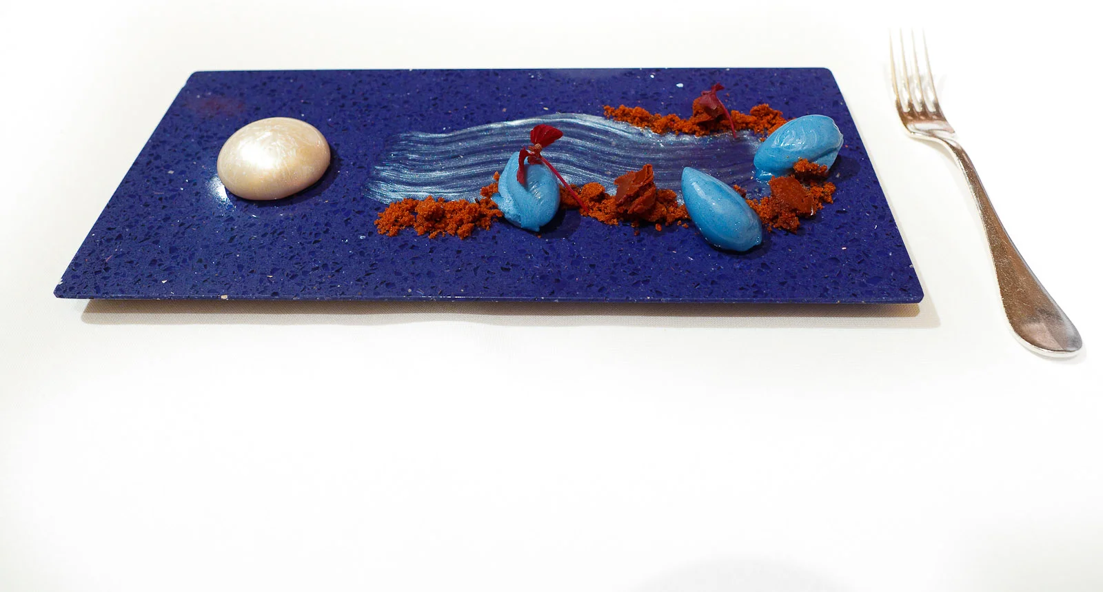 11th Course: Night and Day - Moon, coconut, rum, blue and black ganache