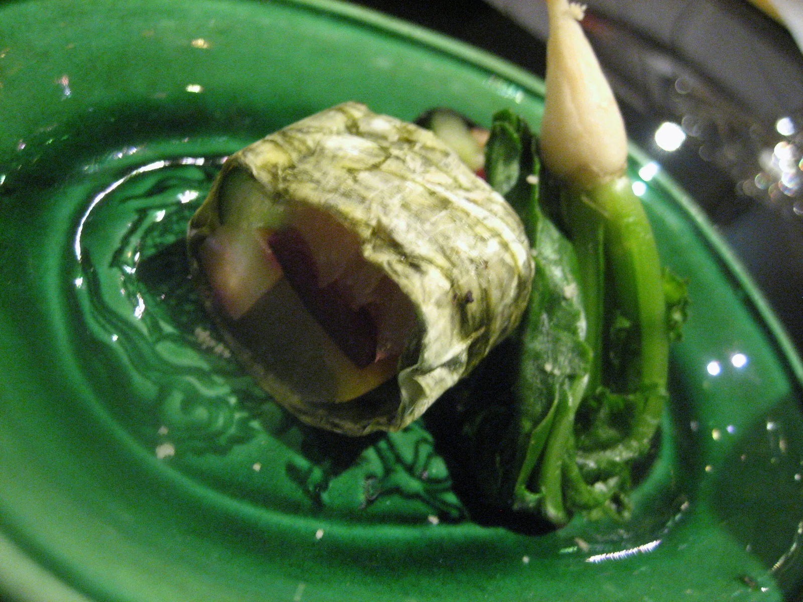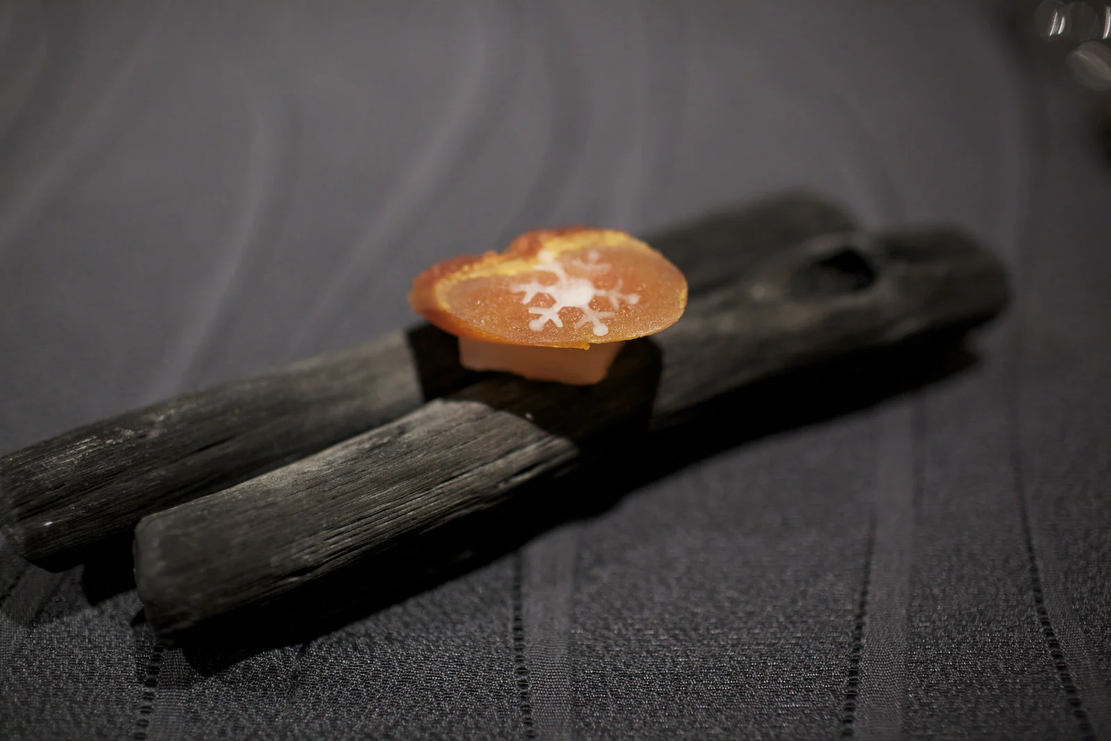 I was the only one at the table who enjoyed the first course, Atelier RyuGin's home made bottarga served with daikon radish in yuzu flavor. A thin slice of cured tuna roe served atop two smoked logs. The dried roe was salty and firm, with a texture not unlike leather. The flavor was intensely salty and of intense dried fish. I thought this was a nice accompaniment to a glass of champagne.
