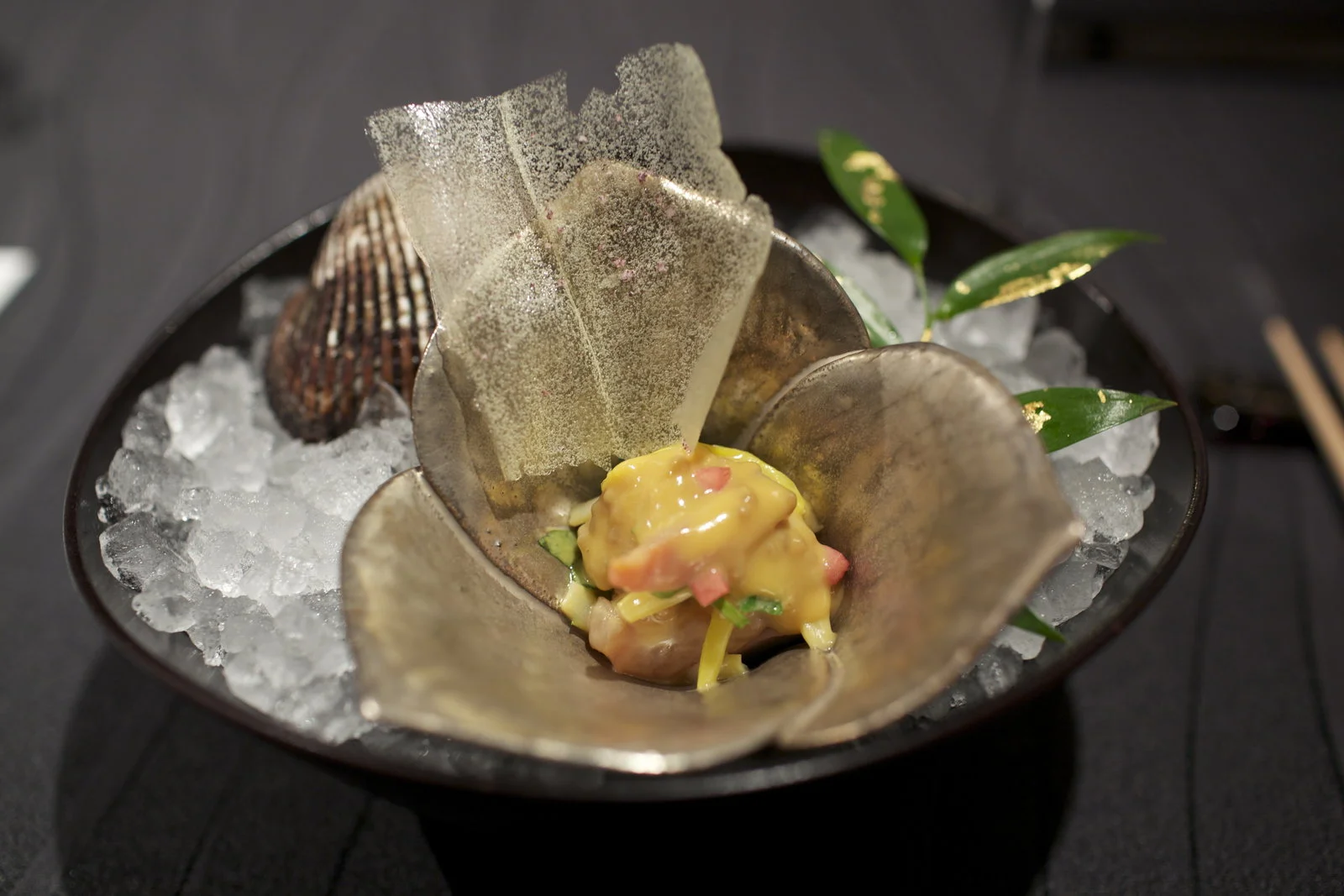 Ankimo, monkfish liver, served with ark shell clam, winter vegetable in apple vinegar, miso, and mustard. Another disappointment. The liver was completely covered with a cold, flavorless paste that prevented any flavor from the monkfish from surfacing. This did not taste like miso pastes that I was used to; this had no character. The miso paste was also unnecessarily jelly-like. Unfortunate, as I love monkfish liver.